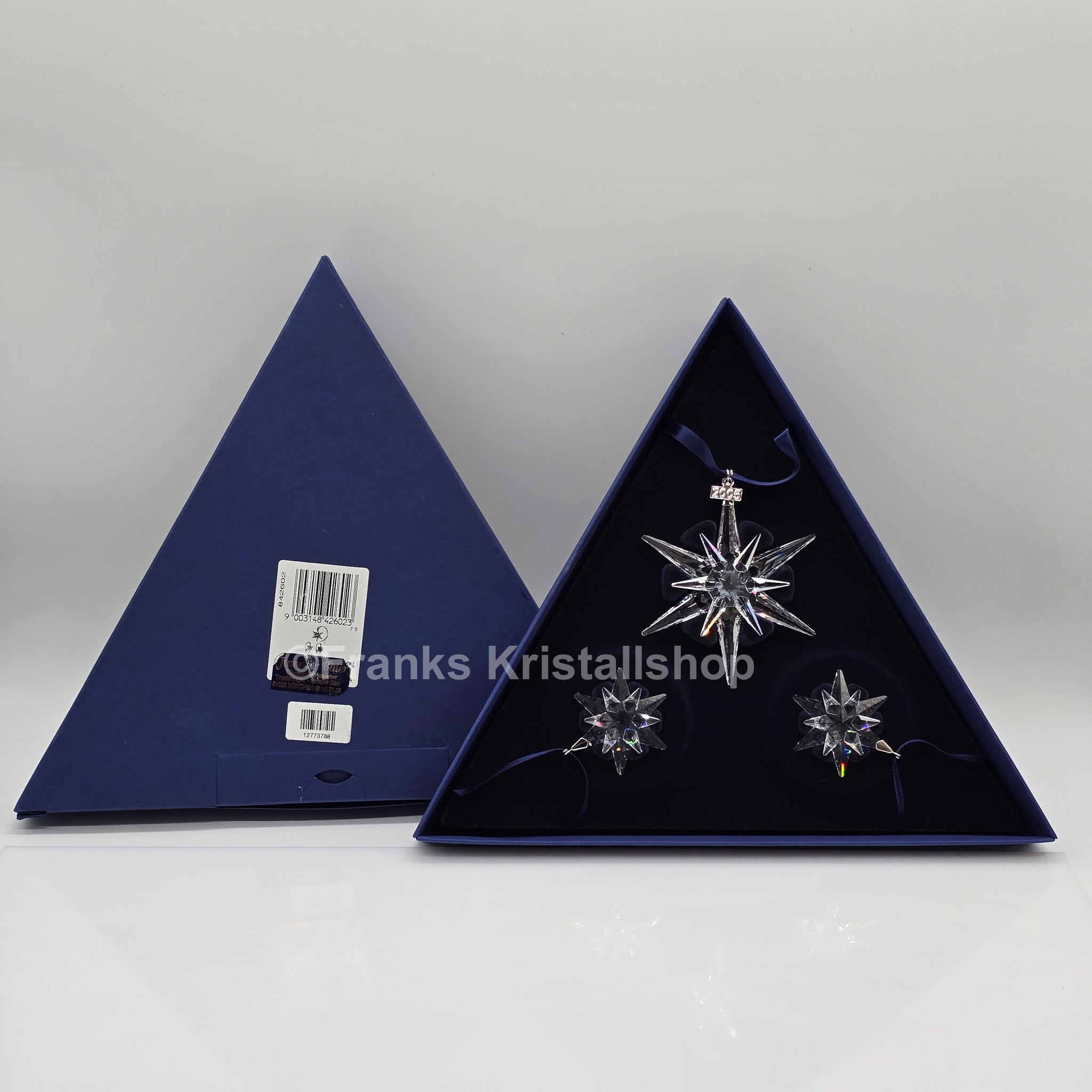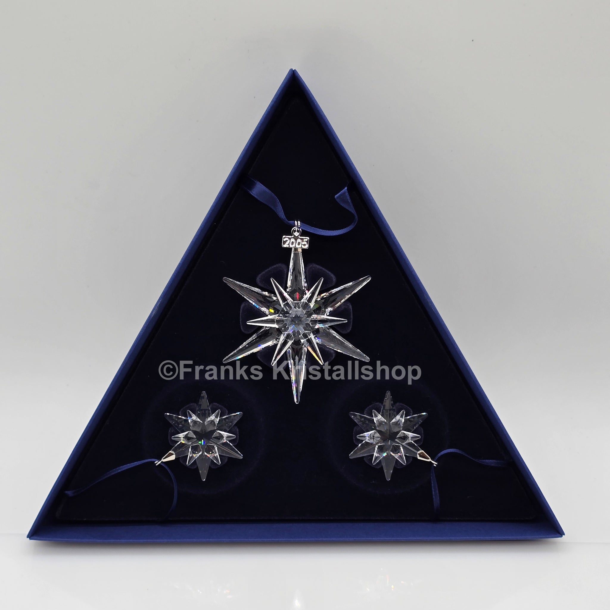 Das beliebte Weihnachtssterneset umfasst den großen Jahresstern 2005 sowie zwei passende kleine Schneeflockenornamente. An dem großen Stern hängt eine Plakette, auf der das Ausgabejahr eingraviert ist. Alle drei Ornamente hängen an blauen Satinbändern. Ein ideales Geschenk und eine schöne Erinnerung an ein besonderes Jahr 2005.