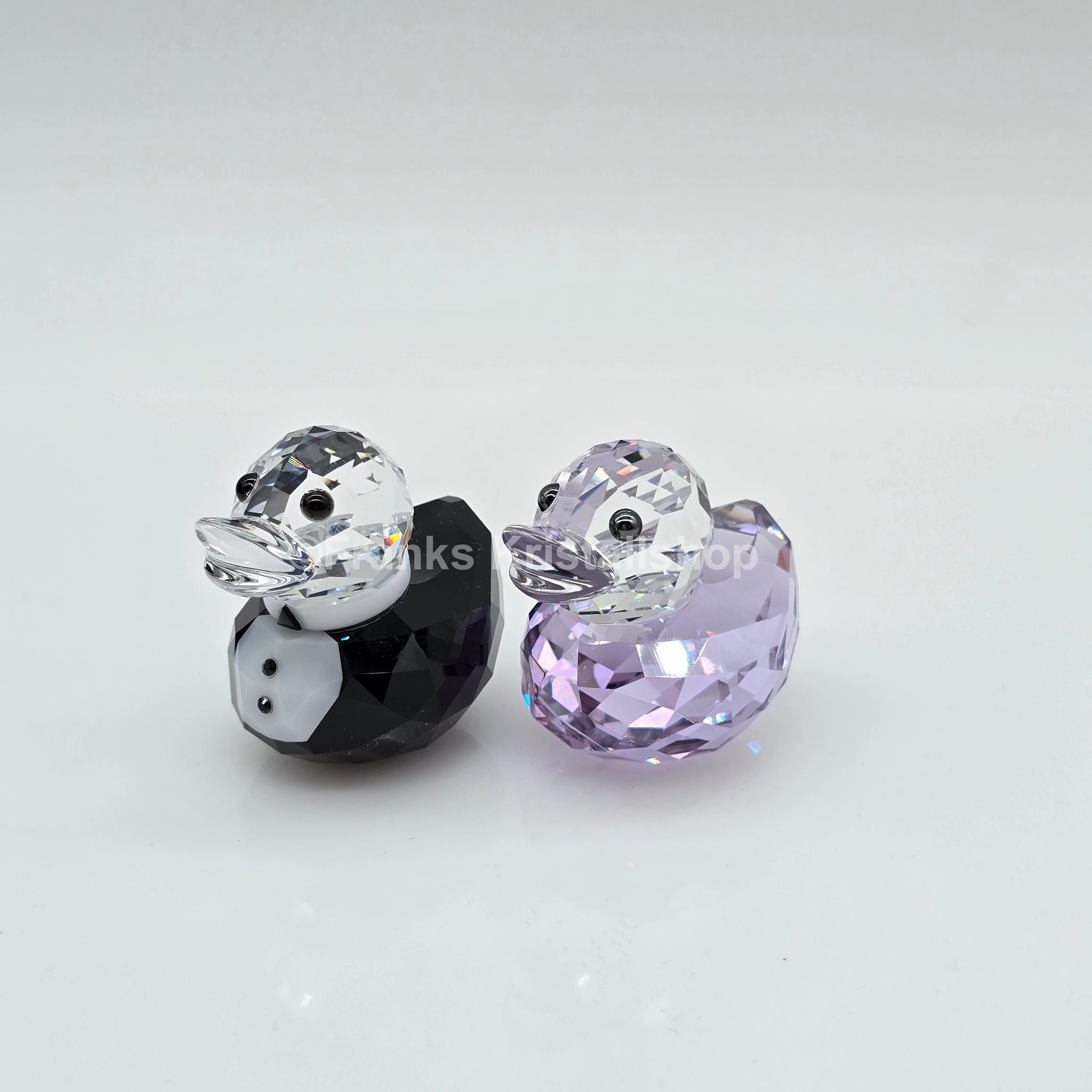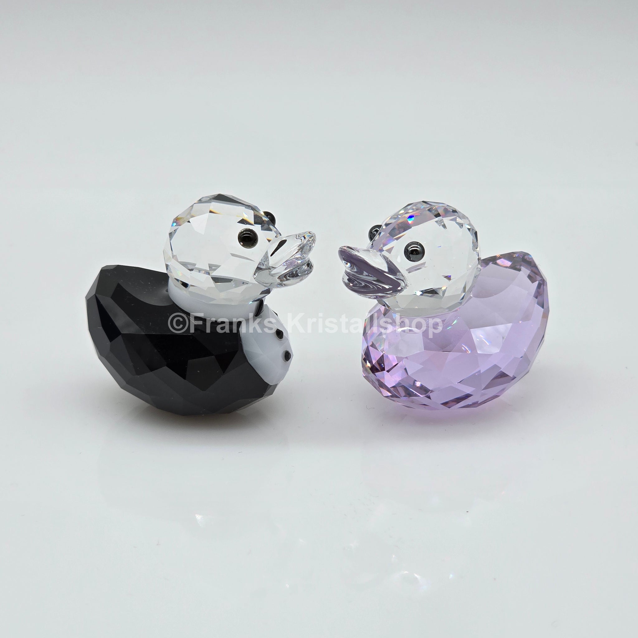 Das Set Sir und Lady Duck vereint zwei charmante Swarovski Happy Ducks. Sir präsentiert sich in klarem Kristall mit Smoking in Jet- und White-Alabaster-Kristall, während Lady in Violet Silver Shade Kristall und mit violettem Lippenstift erstrahlt. Ihre Halskette ist nicht mehr vorhanden, da das Gummiband sich im Laufe der Jahre aufgelöst hat.