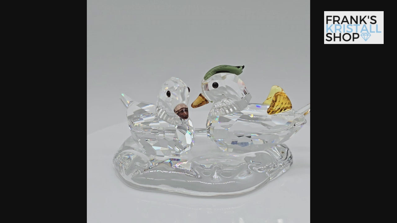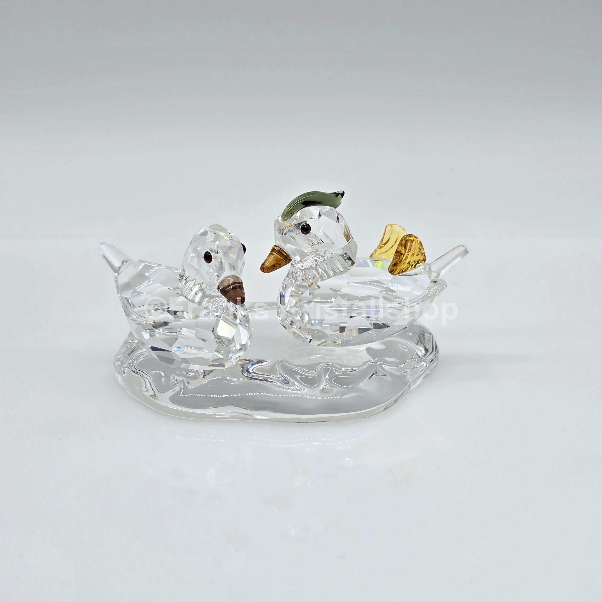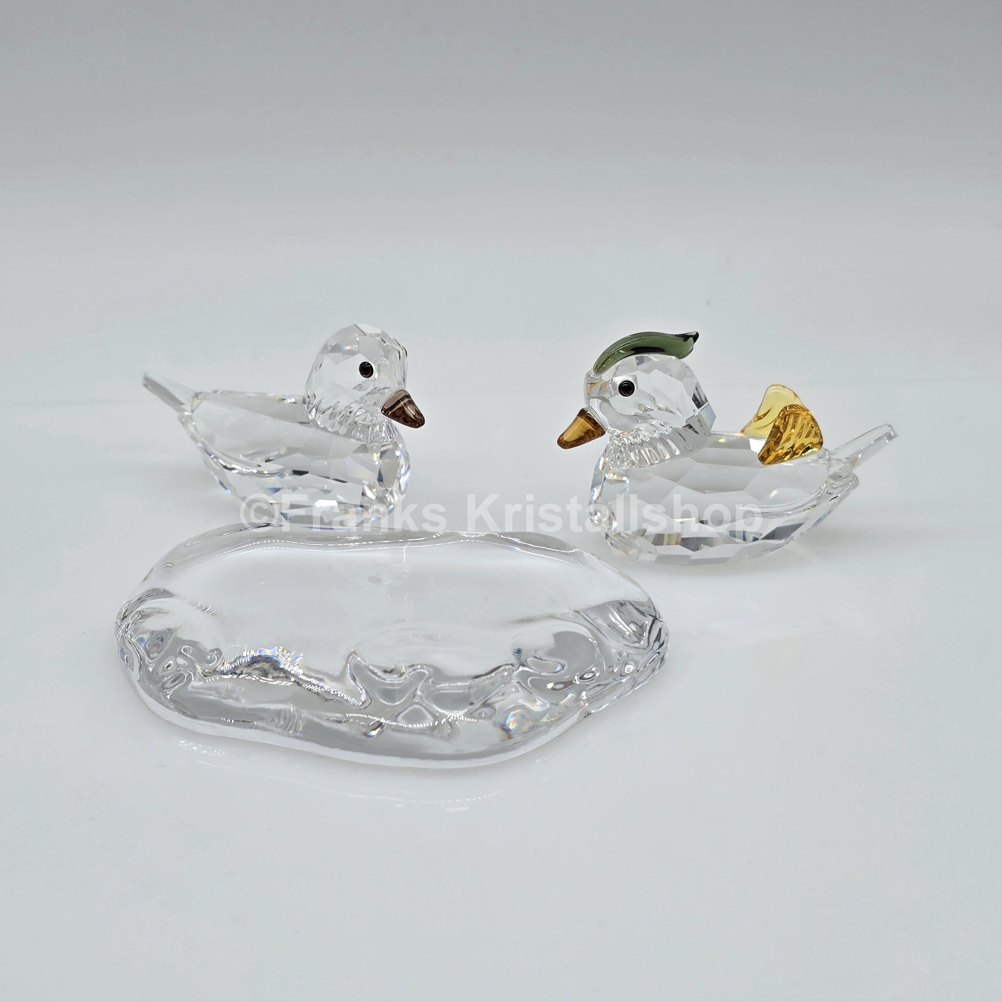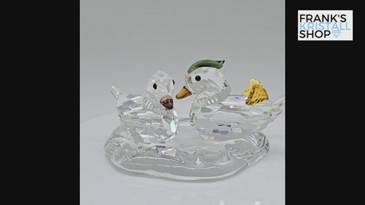 Diese Mandarinenten aus der Themengruppe „Gefiederte Schönheiten“ sind aus klarem Kristall gefertigt. Die Augen und der Schnabel der Enten strahlen in Rauchtopas-Kristall. Das Paar sitzt auf einem abnehmbaren Kristallsockel.
