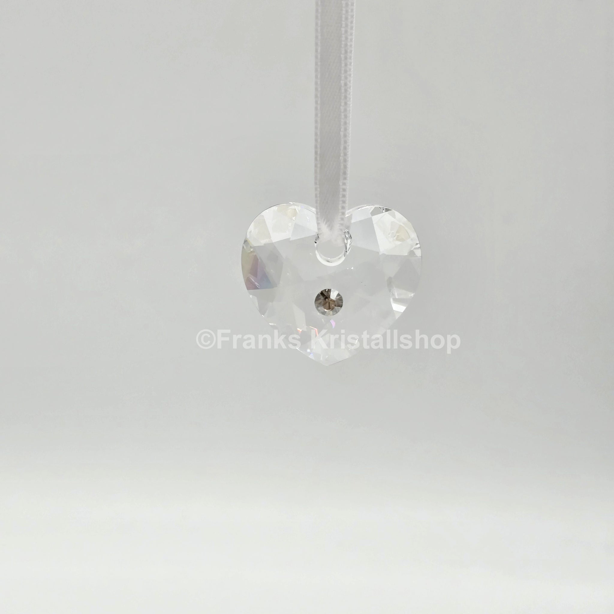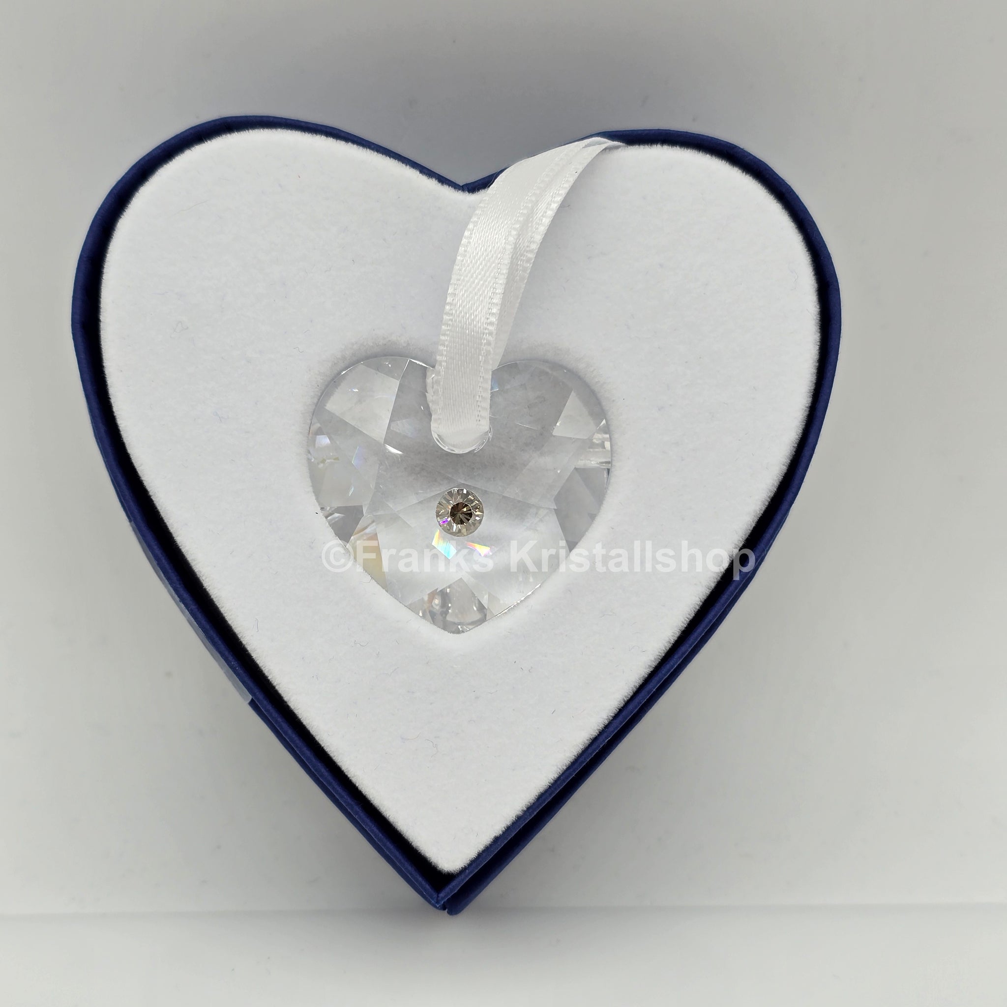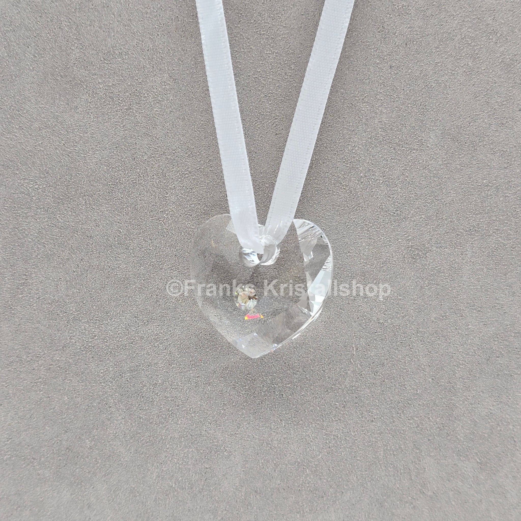 Dieses Herzornament aus klarem Kristall mit einem silberfarbenen Kristallchaton in der Mitte befindet sich an einem weißen Samtbändchen.