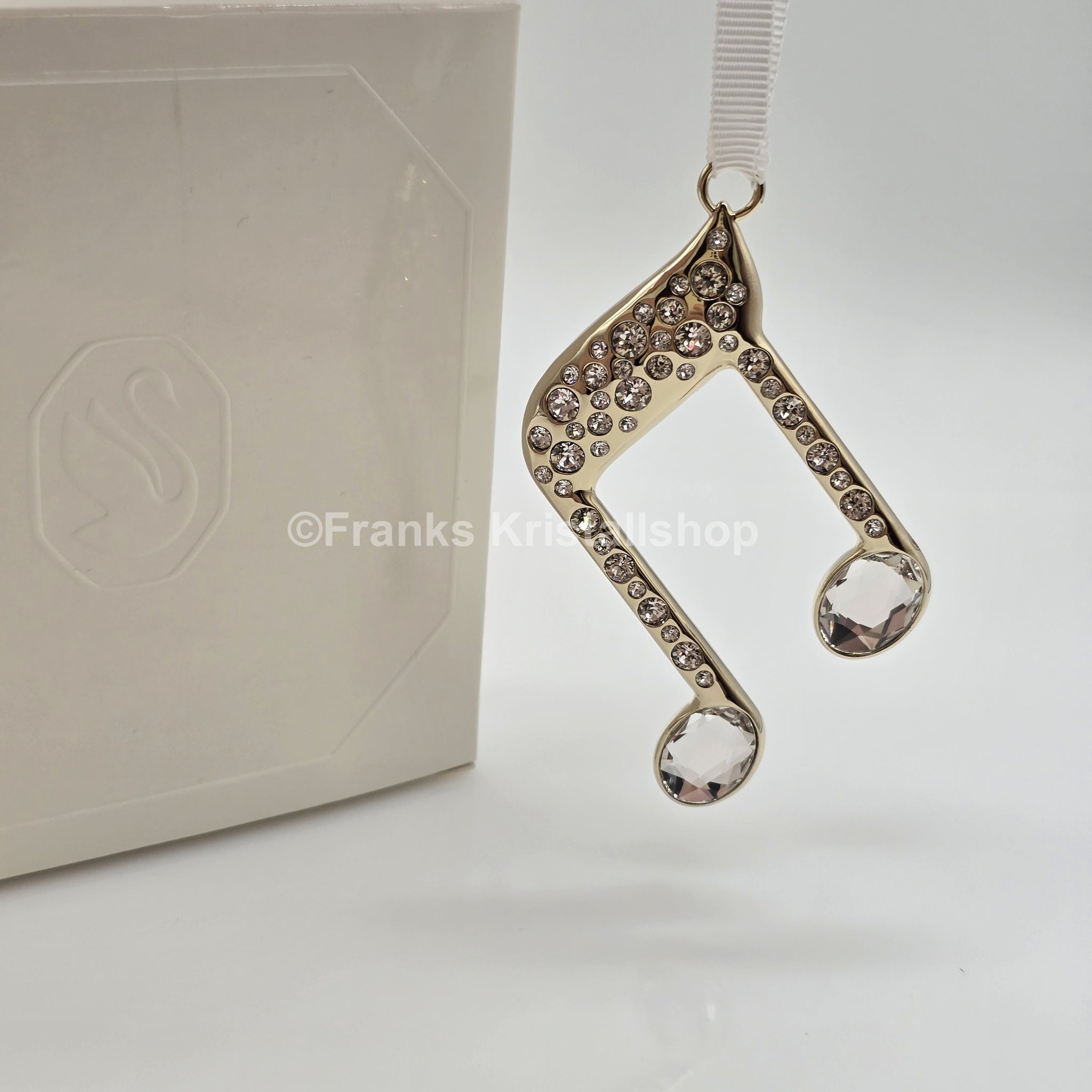 Zeigen Sie Ihre Liebe zu festlicher Musik mit diesem edlen Ornament aus champagner-goldfarbenem Metall und funkelnden Swarovski-Kristallen. Am weißen Ripsband sorgt es für festliche Lichtreflexe – das perfekte Geschenk für Musikliebhaber und Swarovski-Fans.
