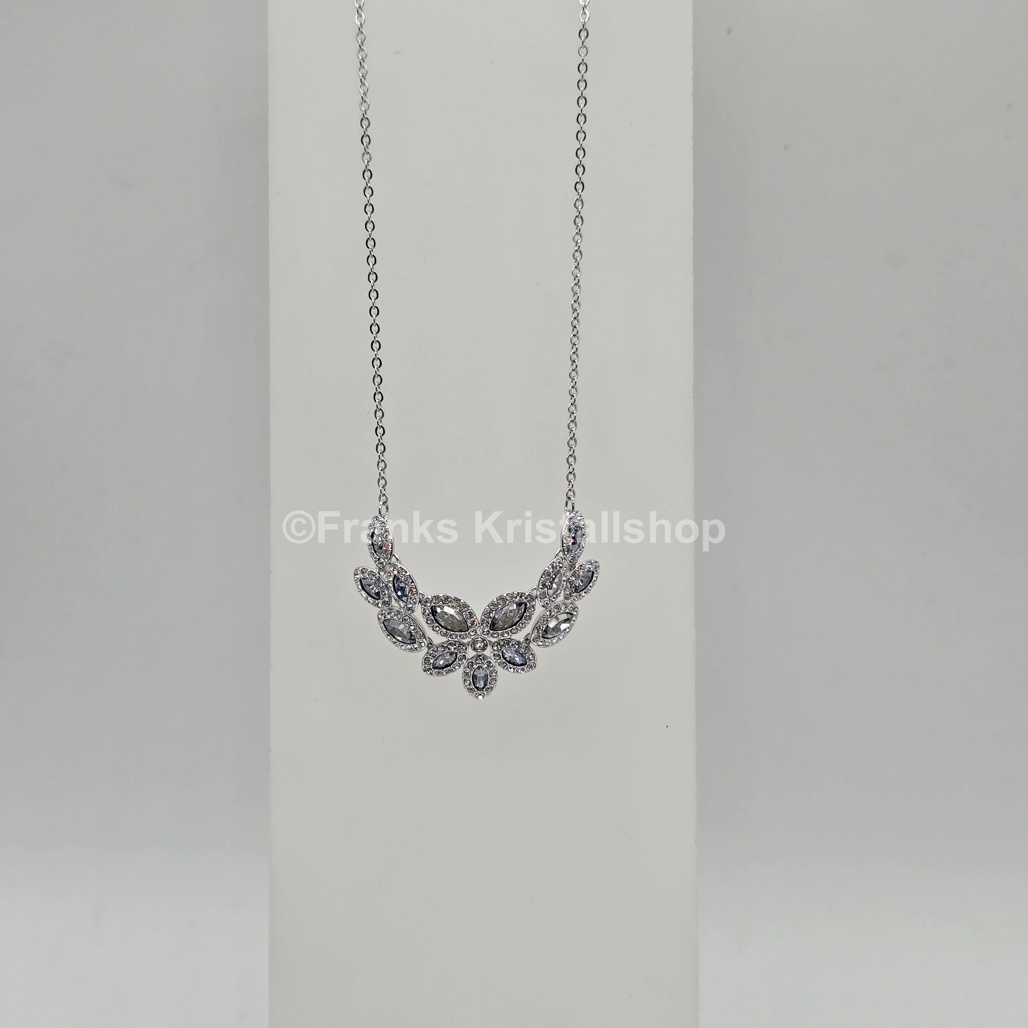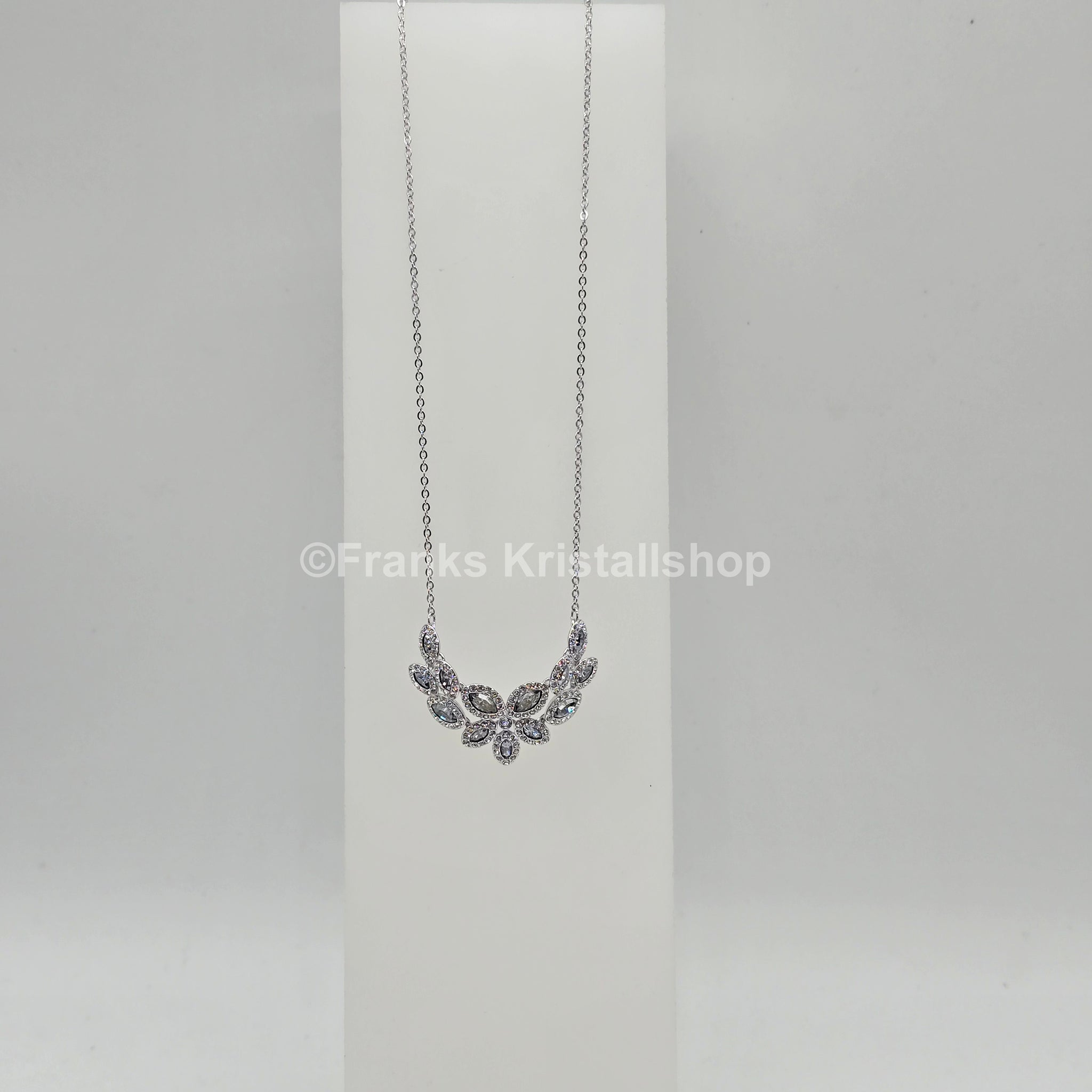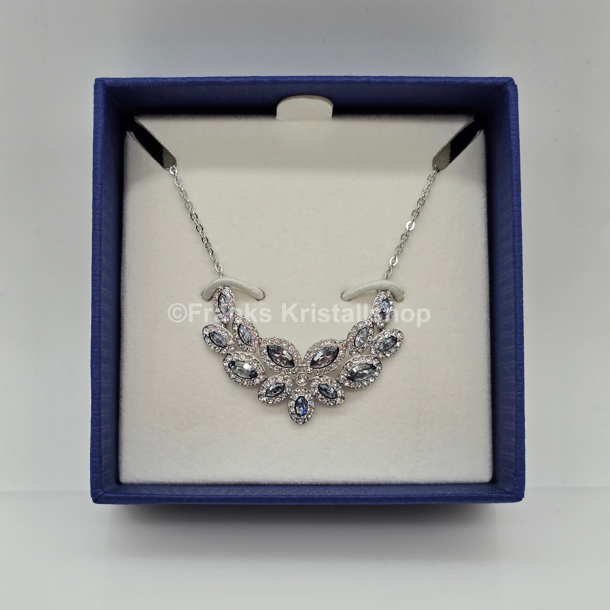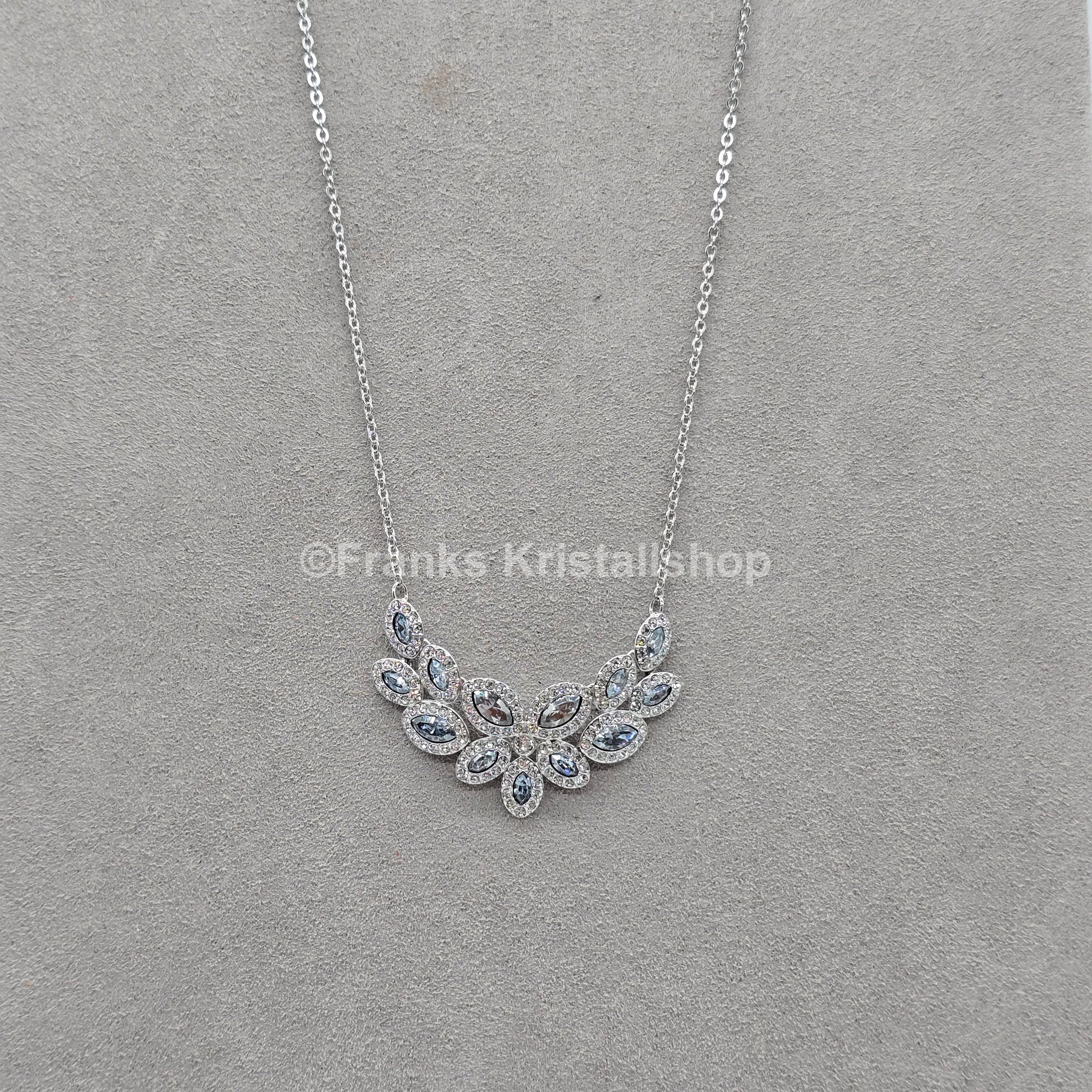 Diese rhodinierte Halskette mit klarem Kristall und einem Hauch von Blau greift den angesagten Front-Mini-Trend auf. Fein gearbeitete Blattelemente, besetzt mit funkelndem Kristallpavé, verleihen ihr eine luxuriöse Note. Perfekt für festliche Anlässe und ein wahrer Blickfang.