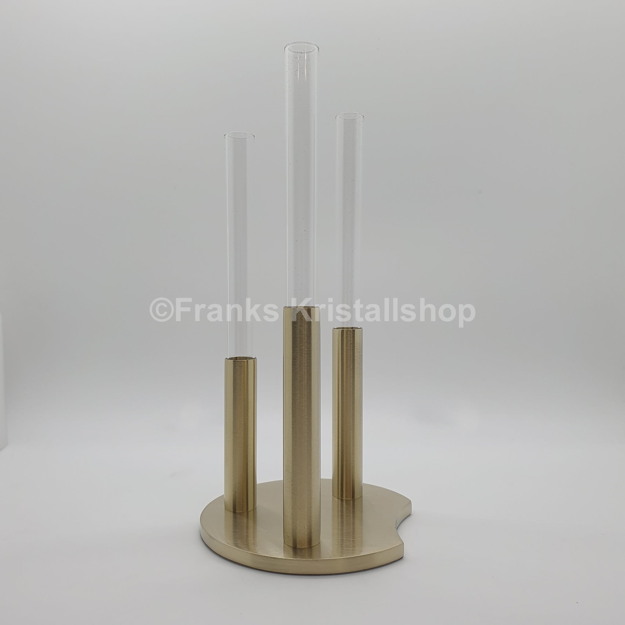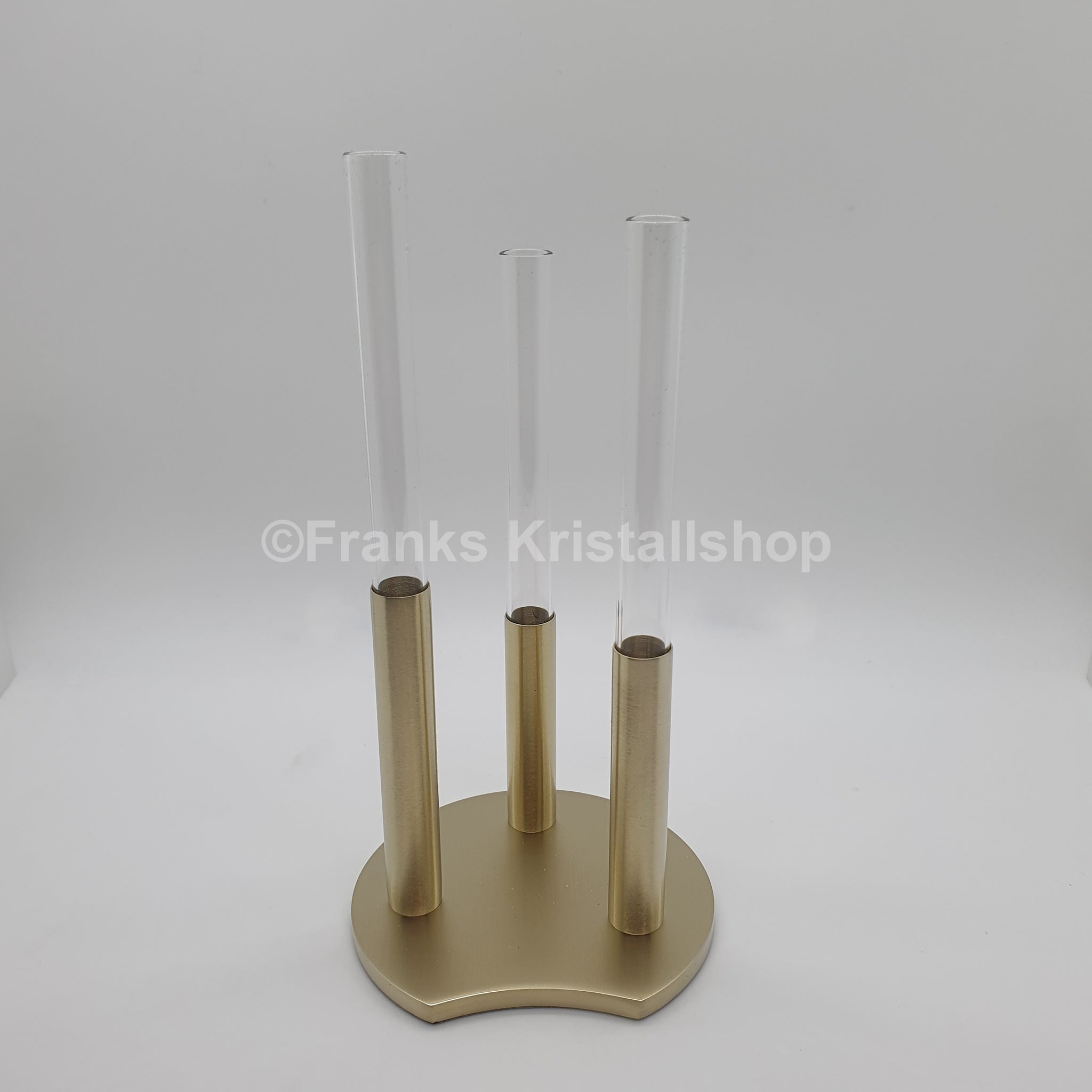Inspiriert vom Trend, einzelne Blumen stilvoll zu präsentieren, vereint diese dekorative Vase aus Glas und goldfarben gebürstetem Metall drei zarte Gefäße zu einem eleganten Ensemble. Mit ihren warmen Tönen setzt sie einen raffinierten Akzent in jedem Zuhause – ein bezauberndes Geschenk, besonders in Kombination mit den funkelnden Kristallblumen oder Blumenmagneten aus der Garden Tales Kollektion.