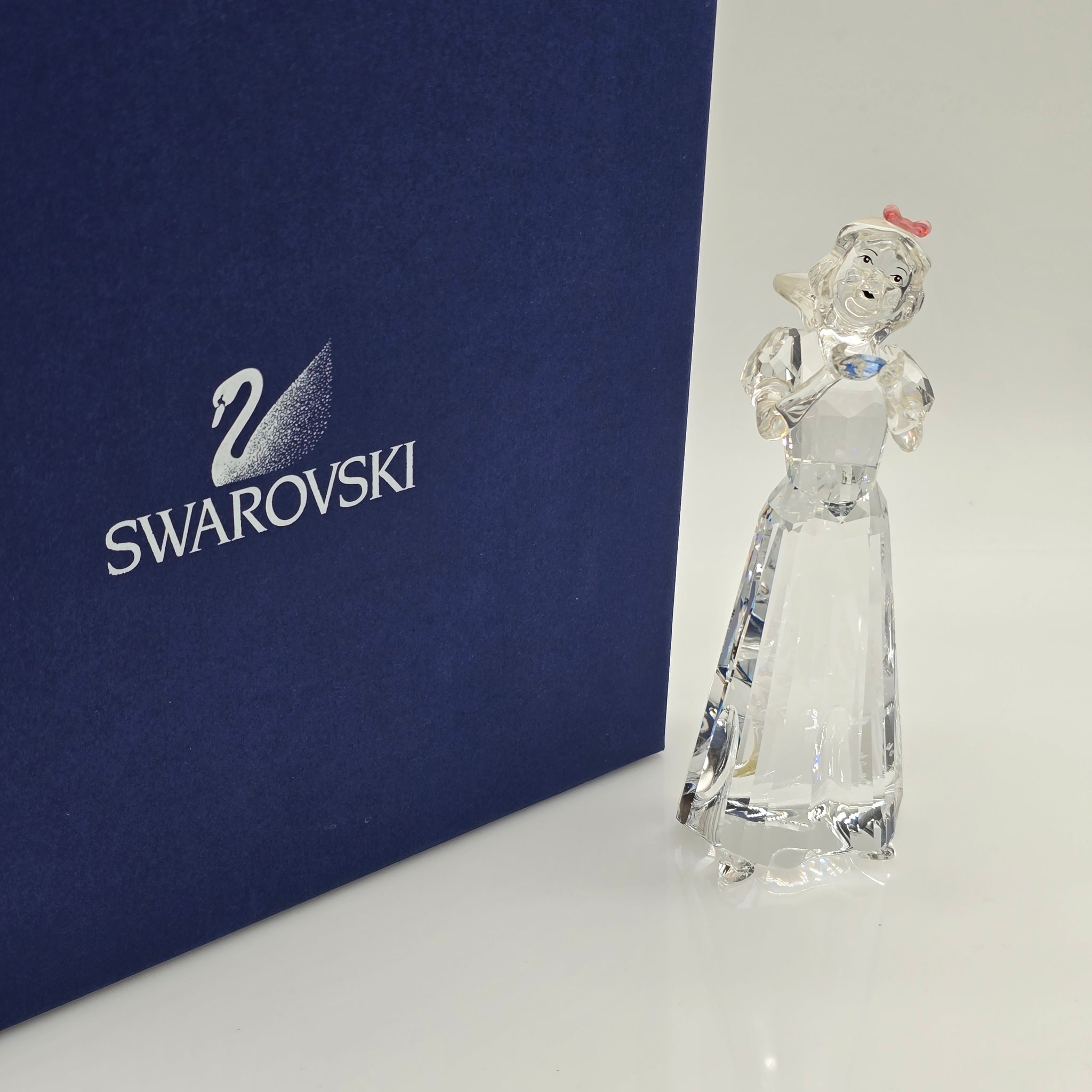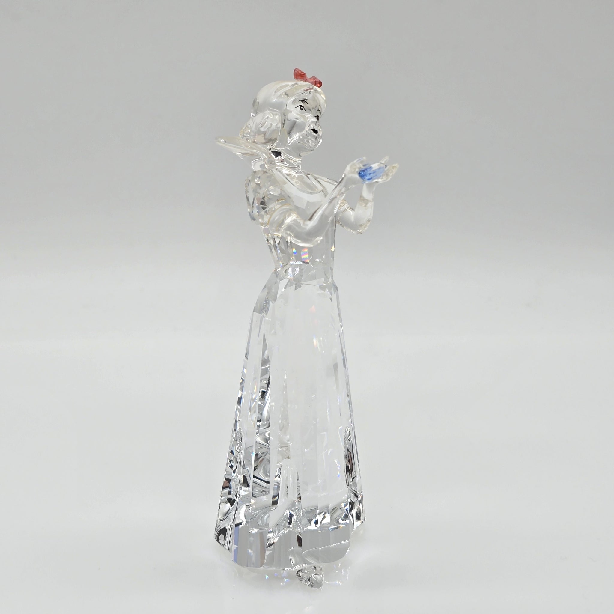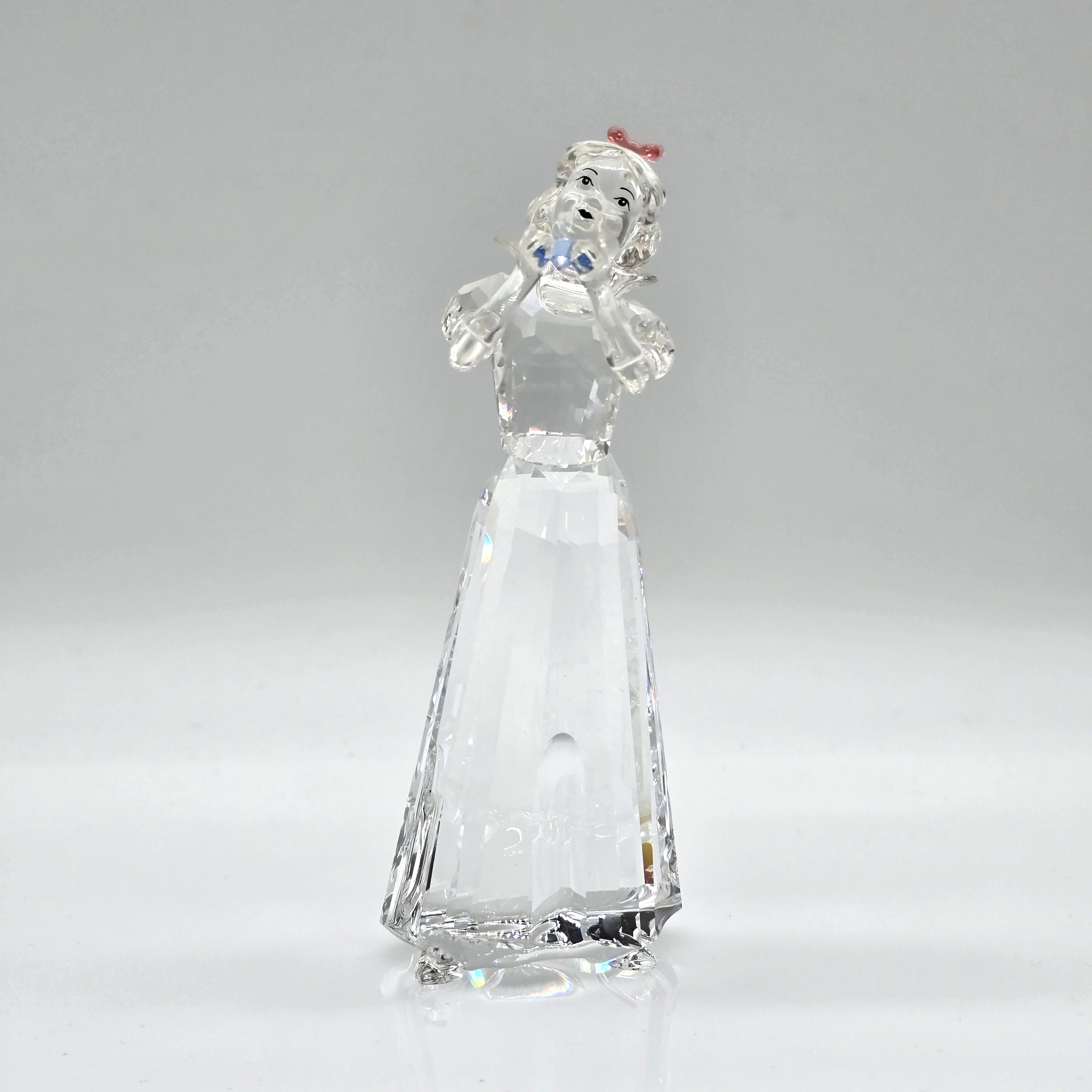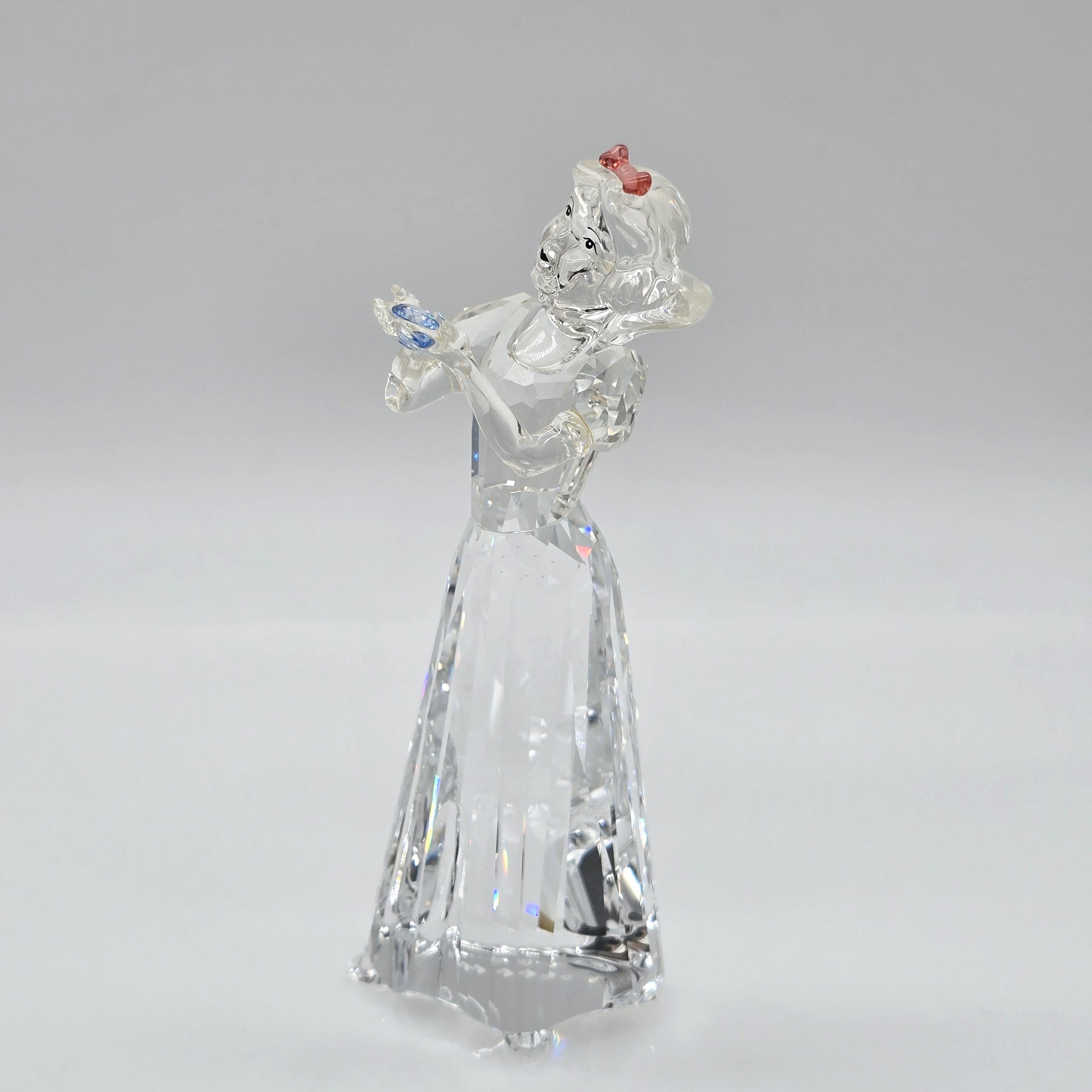 In funkelndem Kristall erstrahlt Disneys Schneewittchen in zauberhafter Schönheit. Ihr facettierter Körper aus klarem Kristall, der glatte Kopf und die zarten Arme verleihen ihr eine elegante Anmut. Ausdrucksstarke schwarze Augen, Brauen und Lippen sowie die Schleife aus rosafarbenem Kristall und der arktisblau funkelnde Chaton in ihren Händen vollenden diese hinreißende Figur.