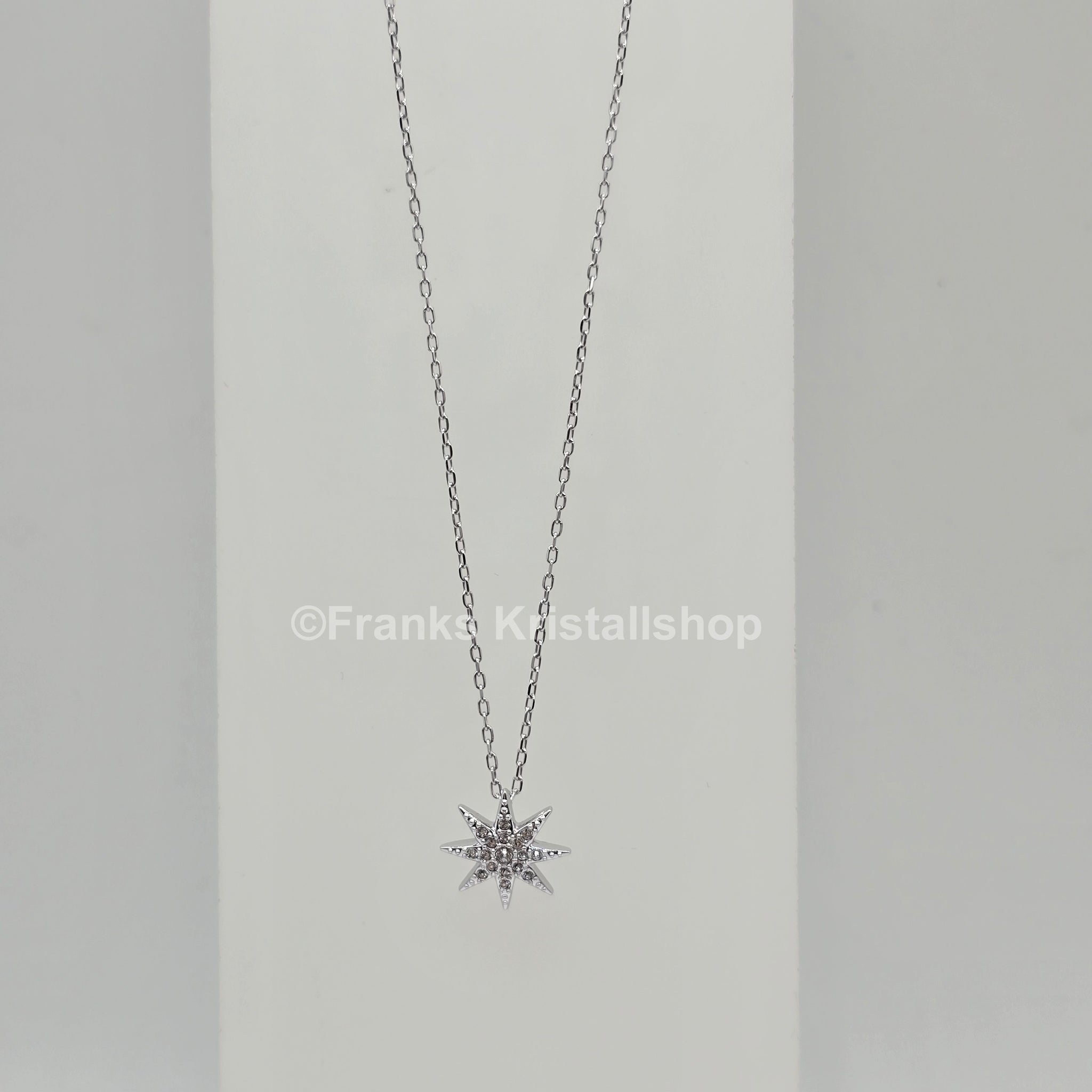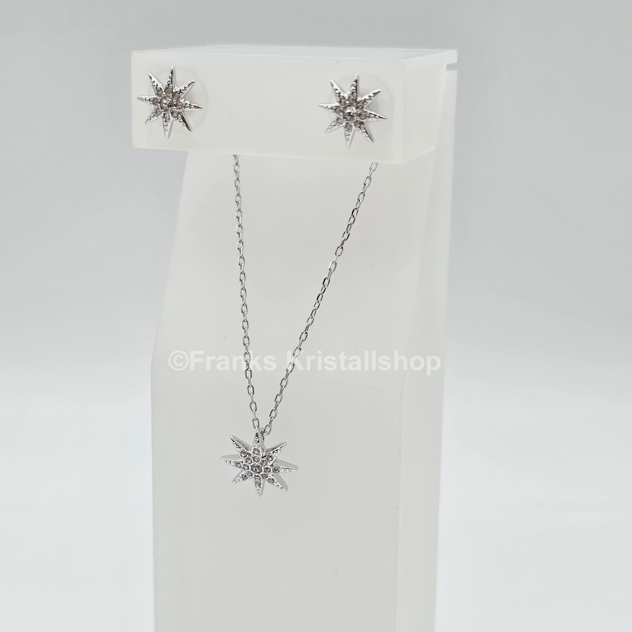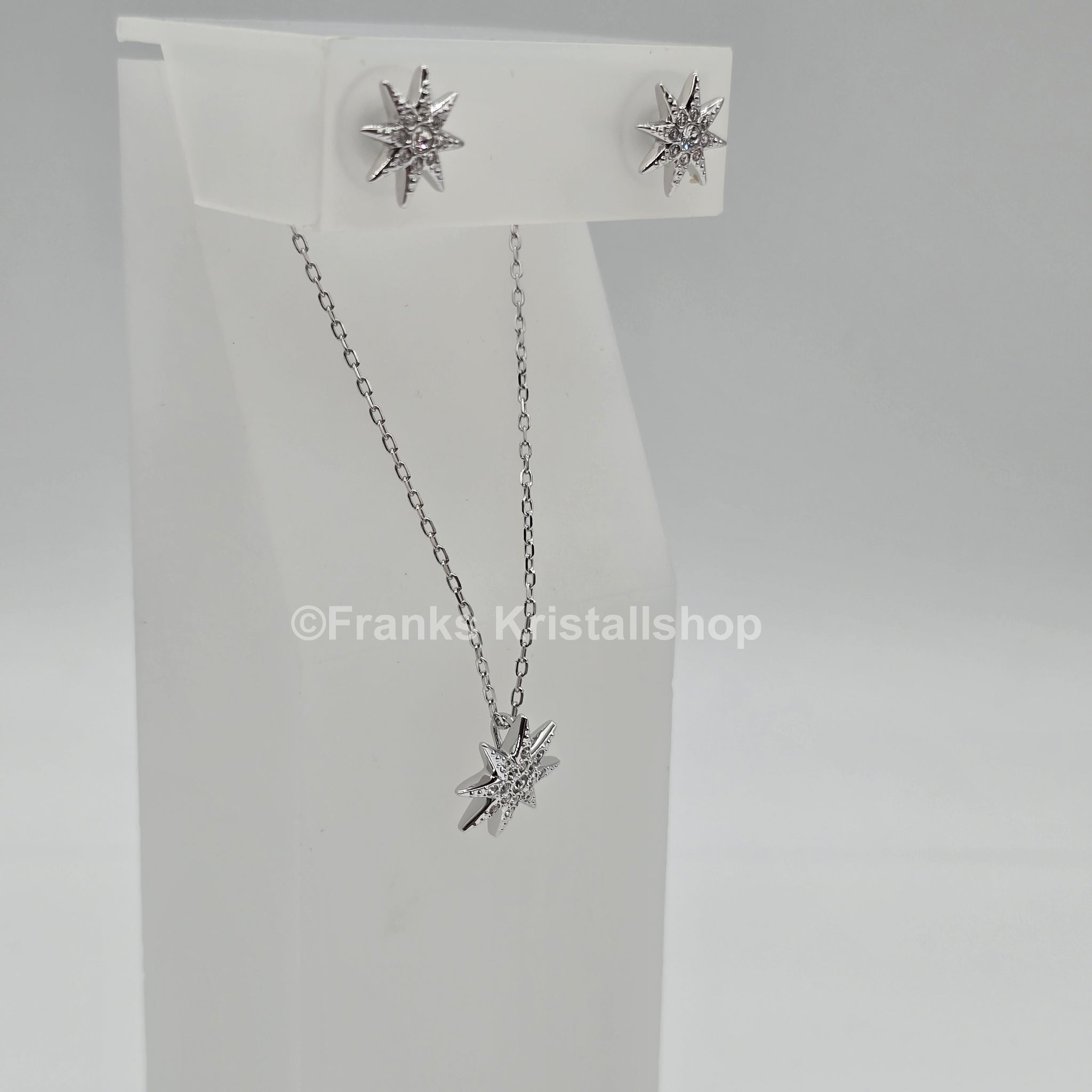 Das Set besteht aus einer Halskette mit einem Stern-Anhänger und passenden Stern-Ohrringen. Der Schmuck ist mit Swarovski Kristallen verziert und verleiht jedem Outfit einen eleganten Touch. Das Metall des Schmucksets ist rhodiniert, was ihm einen glänzenden und langlebigen Look verleiht. Es ist ein wunderschönes Set, das perfekt als Geschenk oder für besondere Anlässe geeignet ist.