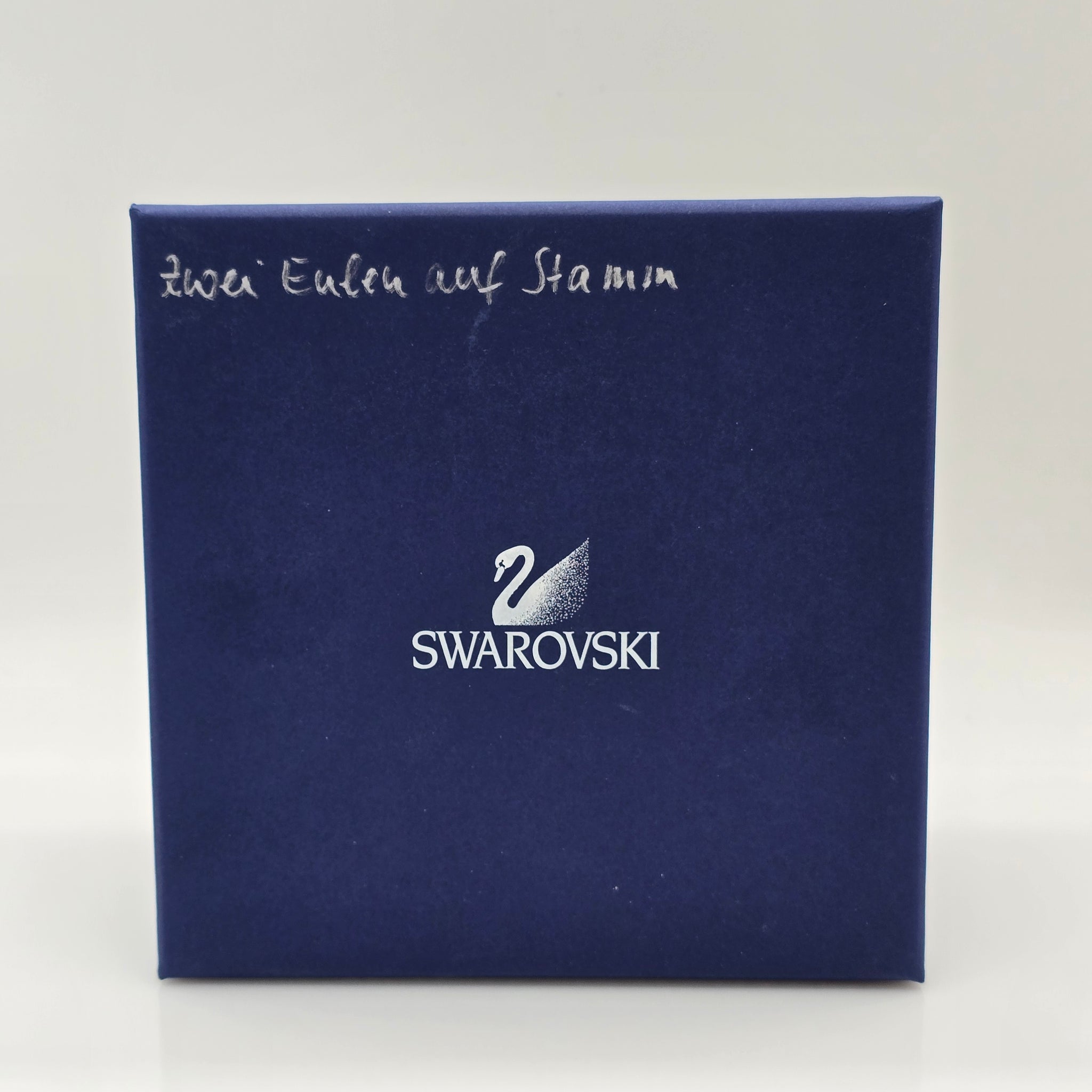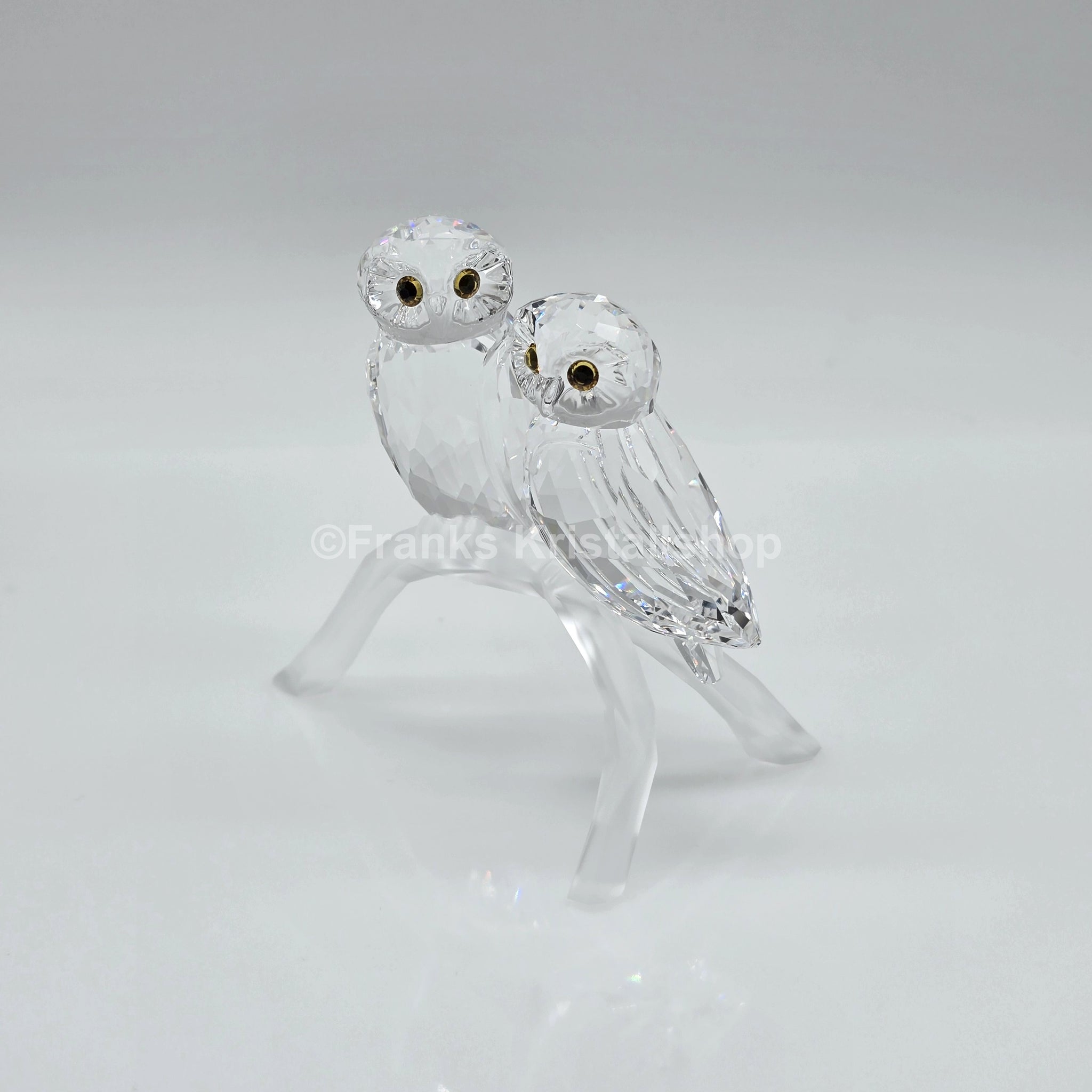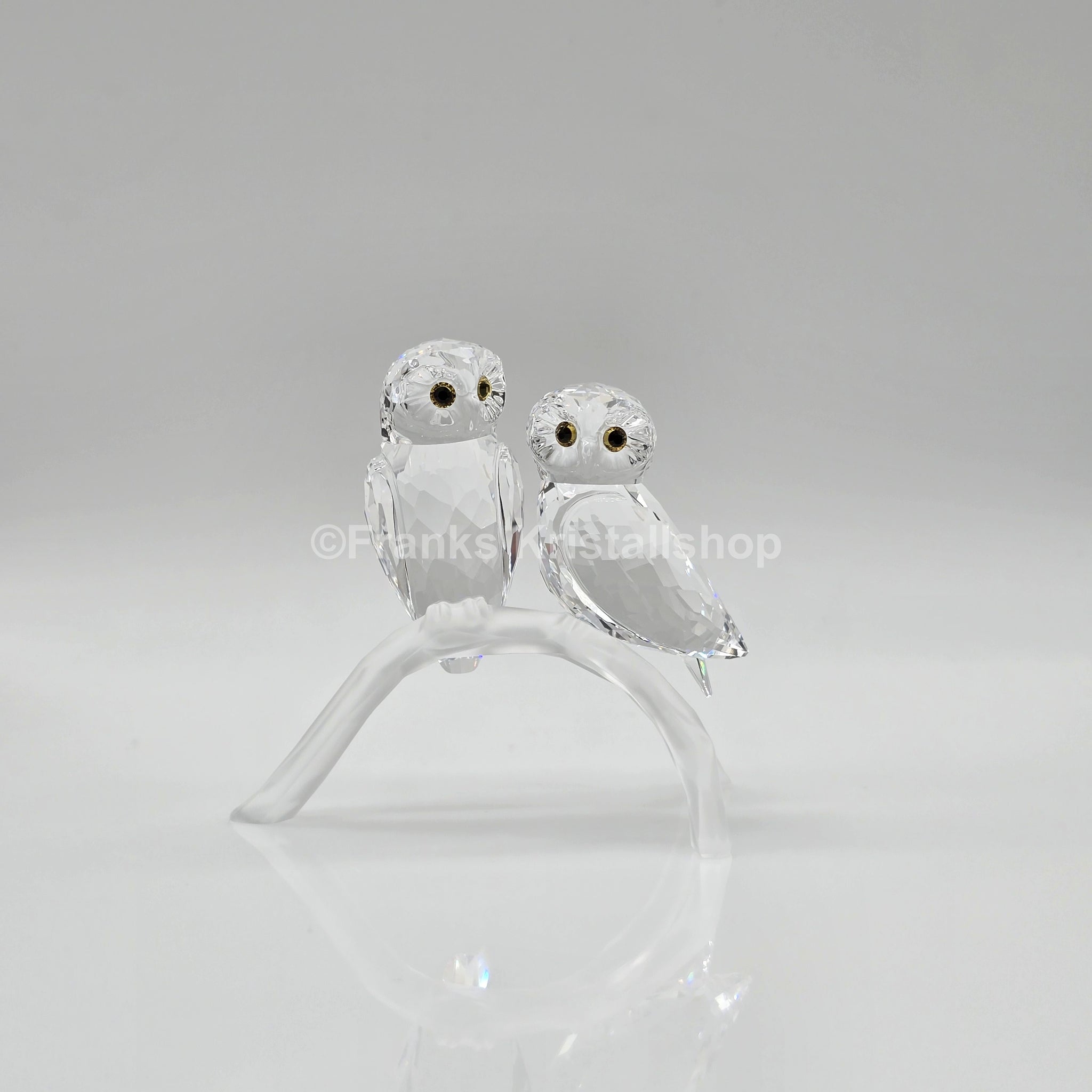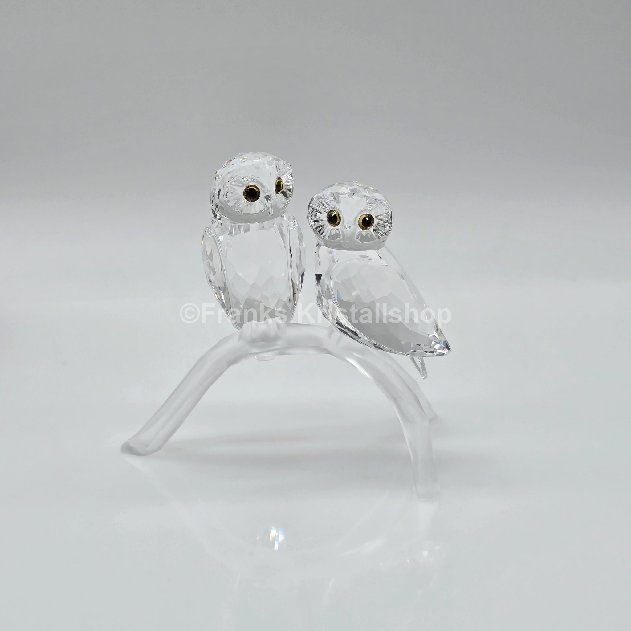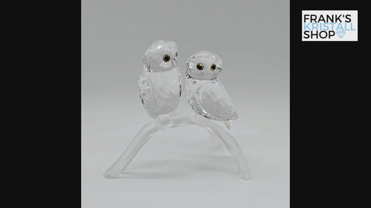 Die beiden Eulen, naturgetreu nachgebildet aus Kristall, schauen sich verliebt an. Das Eulenpaar sitzt auf einem Ast aus mattem Kristall. Die Augen in Light Topaz und Jet Kristall. Perfekt als Geschenk oder zur Dekoration.