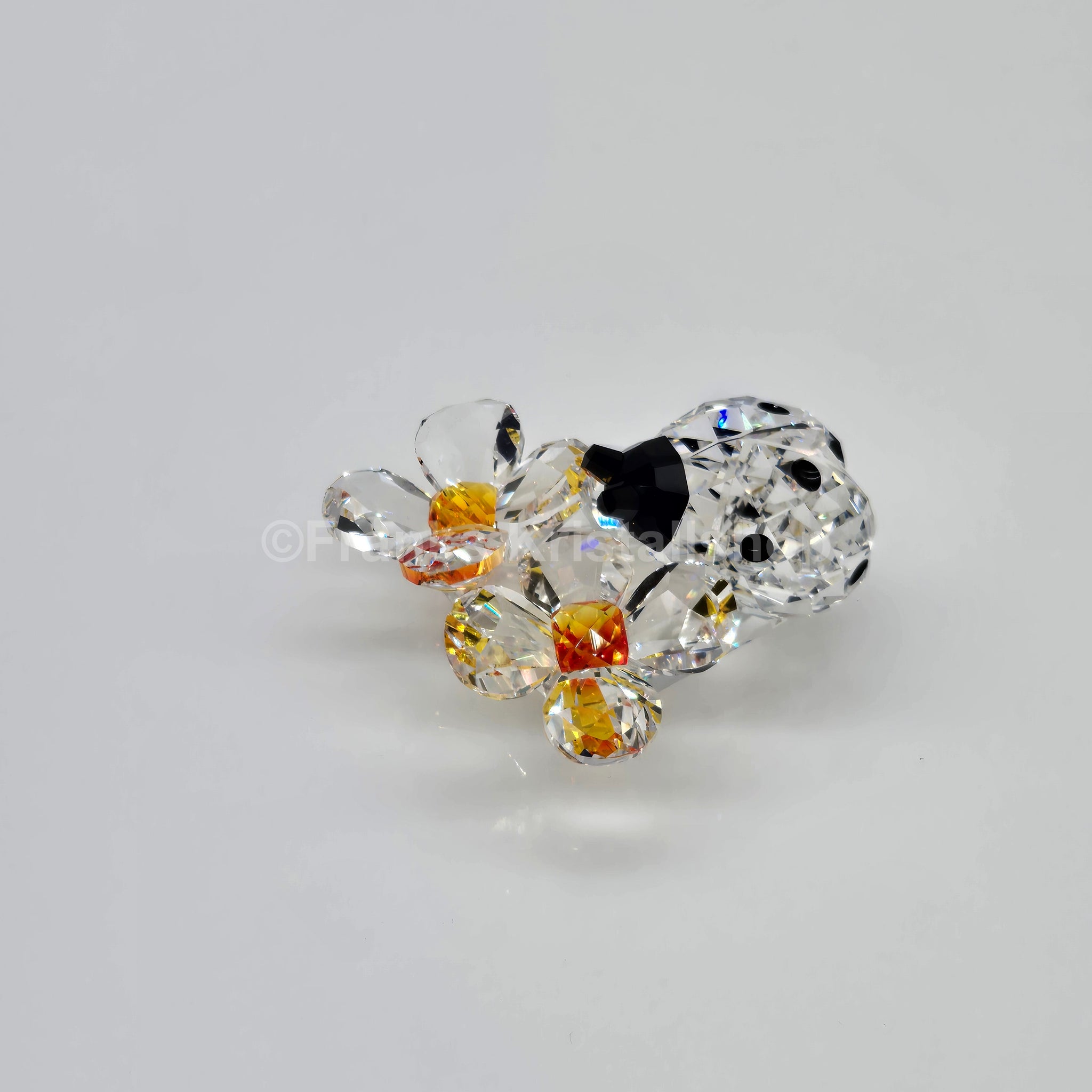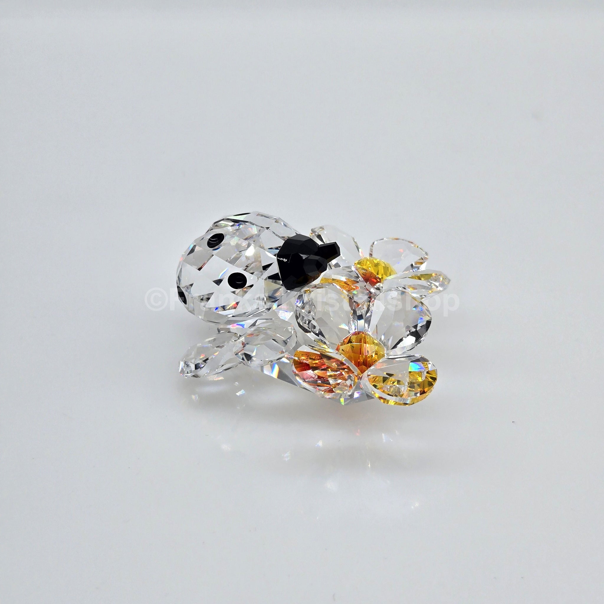 Dieser Marienkäfer auf einer Blüte war Teil der Themengruppe „Im geheimen Garten“. Der Marienkäfer besteht aus klarem und tiefschwarzem Kristall, während die Blume aus klarem Kristall gefertigt ist und in ihrer Mitte ein funkelnder Feueropal glänzt.