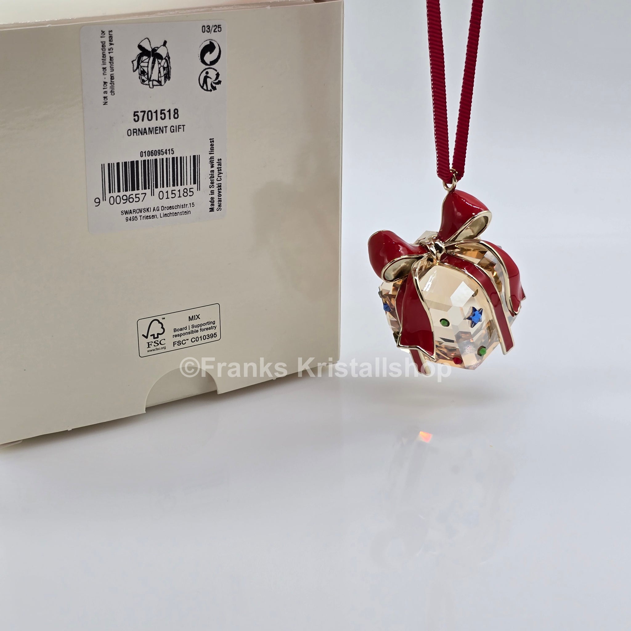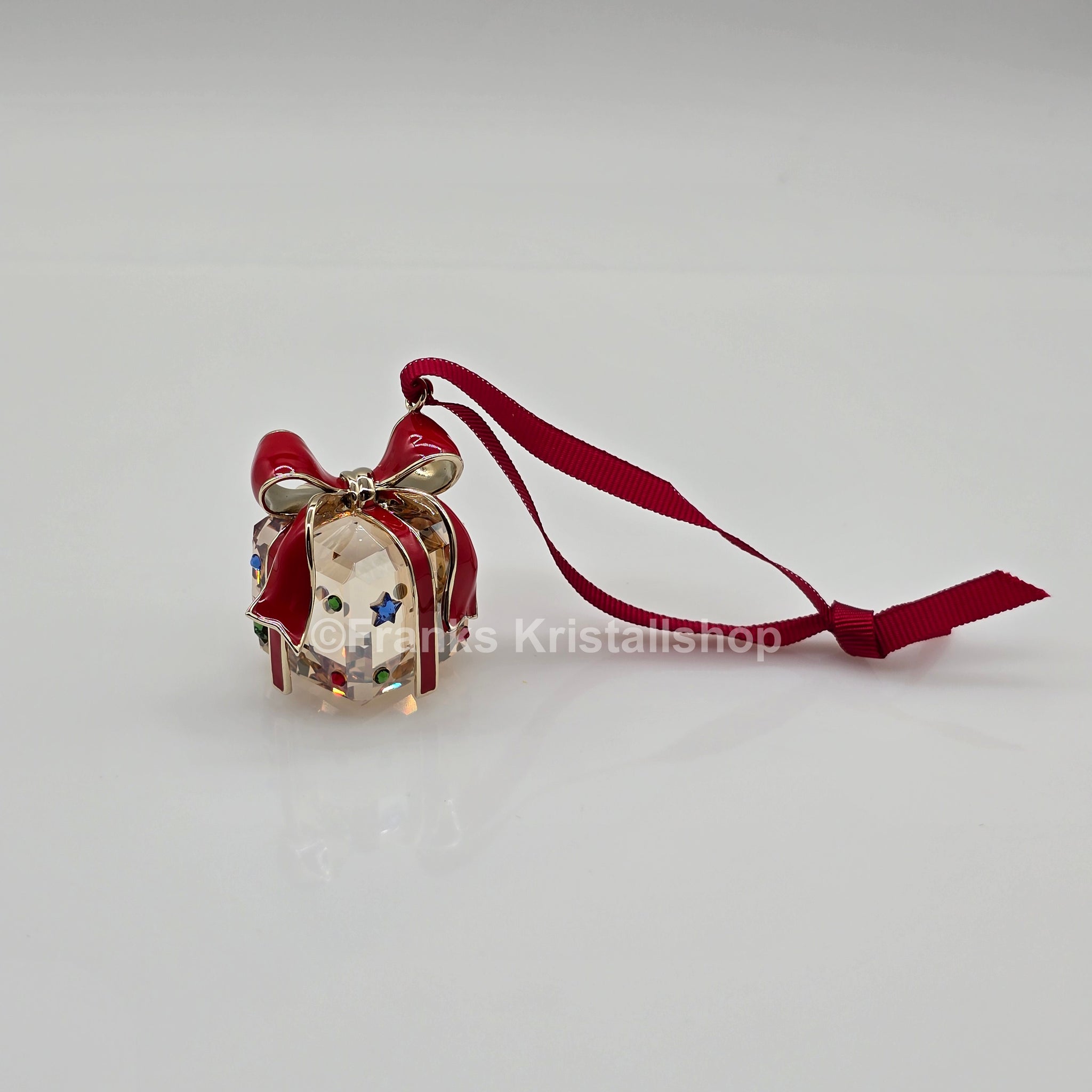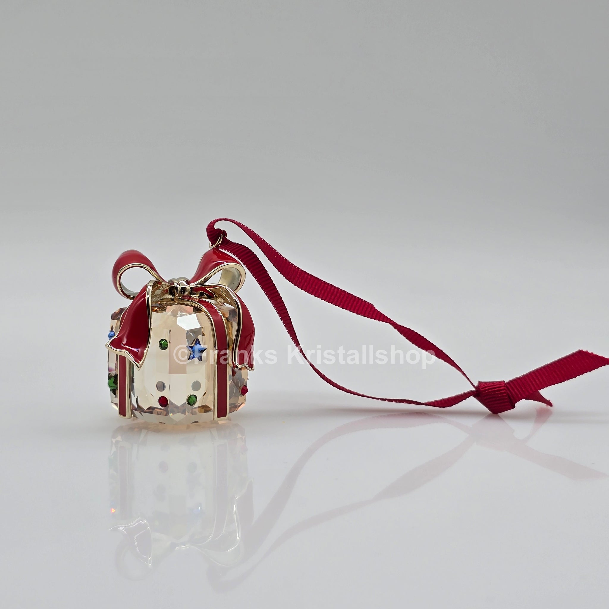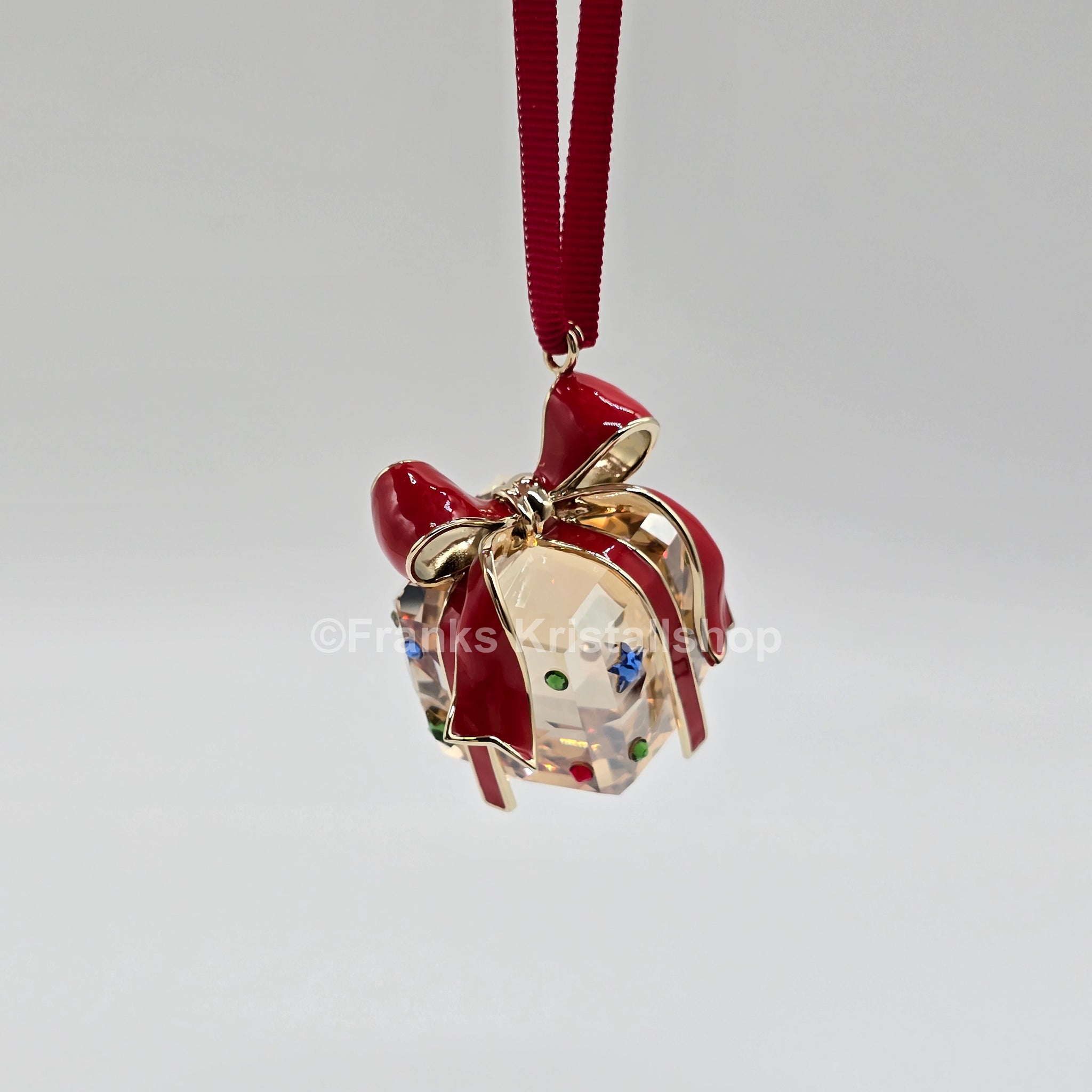 Dieses verspielte Geschenkornament hängt an einem roten Ripsband und funkelt mit zahlreichen Facetten im Golden Shadow-Effekt. Rote, grüne und blaue Kristalle sowie ein champagnergoldfarbenes Metallband mit roter Lackierung verleihen dem Design festliche Eleganz. Ideal zum Verschenken oder zum Verschönern Ihrer Weihnachtsdekoration.