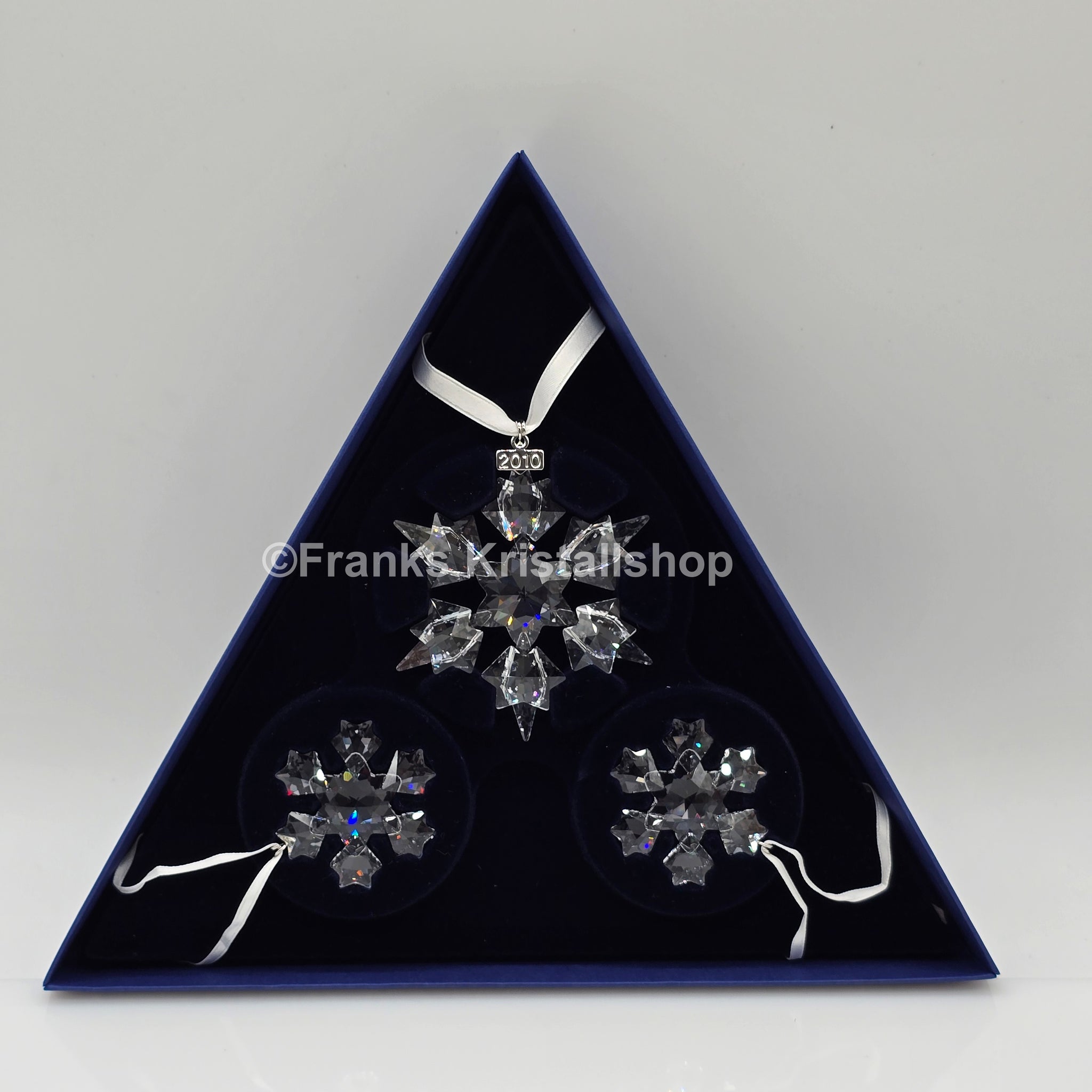 Das beliebte Weihnachtssterneset umfasst den großen Jahresstern 2010 sowie zwei passende kleine Schneeflockenornamente. An dem großen Stern hängt eine Plakette, auf der das Ausgabejahr eingraviert ist. Alle drei Ornamente hängen an weißen Satinbändern. Ein ideales Geschenk und eine schöne Erinnerung an ein besonderes Jahr 2010.