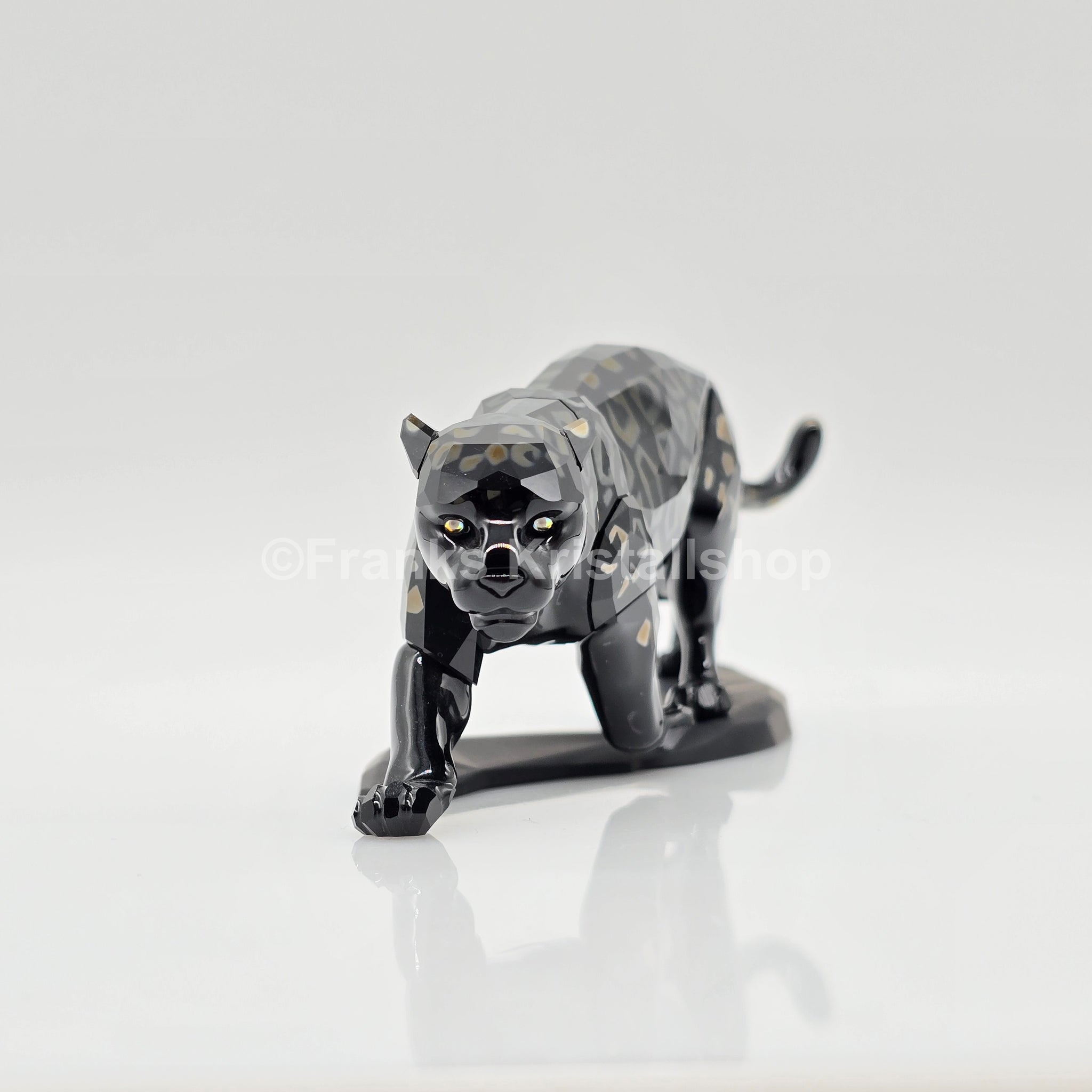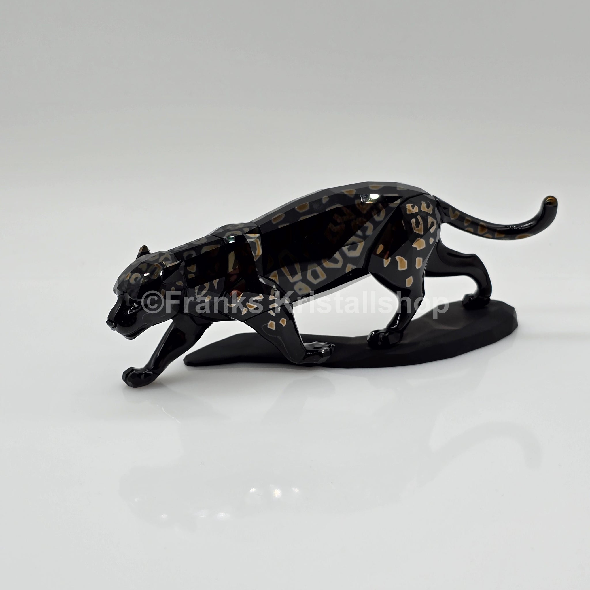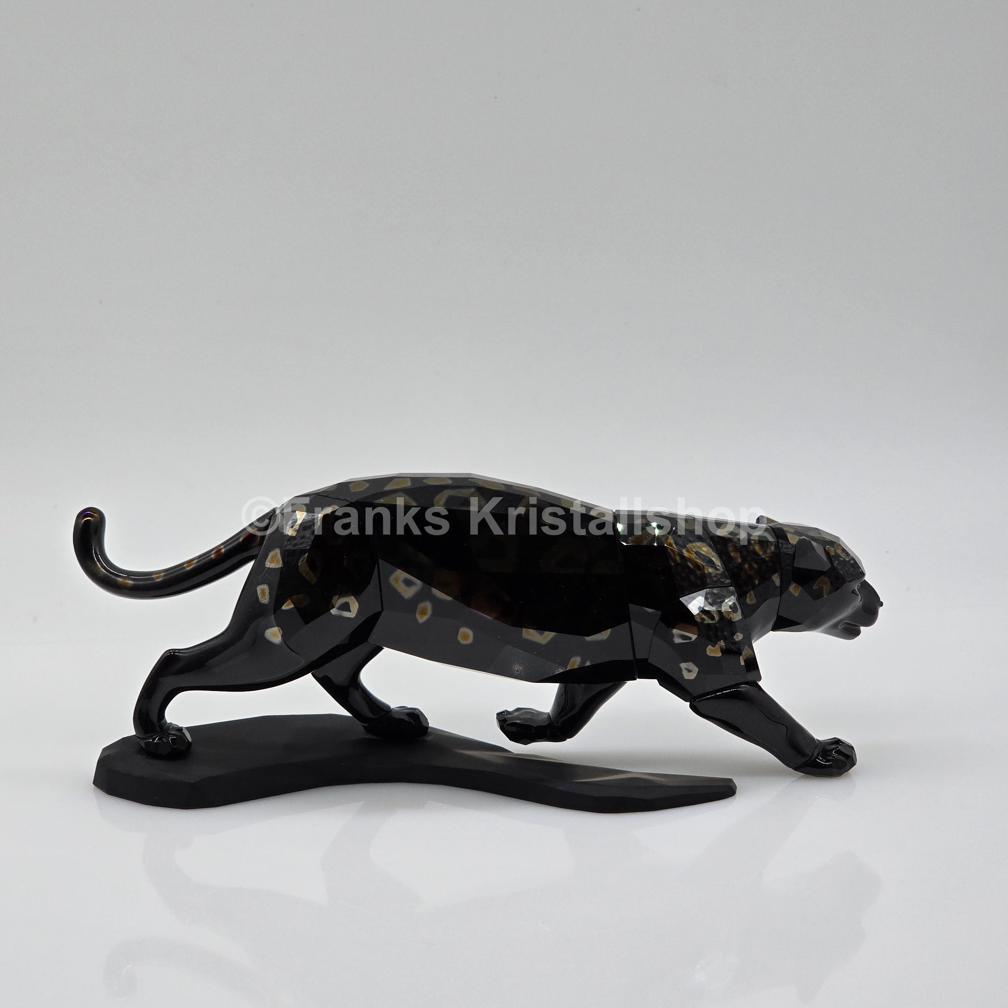 Der funkelnde Jaguar steht auf einem schwarzen Kristallsockel. Die Figur hat einen schwarzen Körper mit Akzenten in Golden Shade. Die Figur war Teil der Themengruppe "Crystal & Jet".
