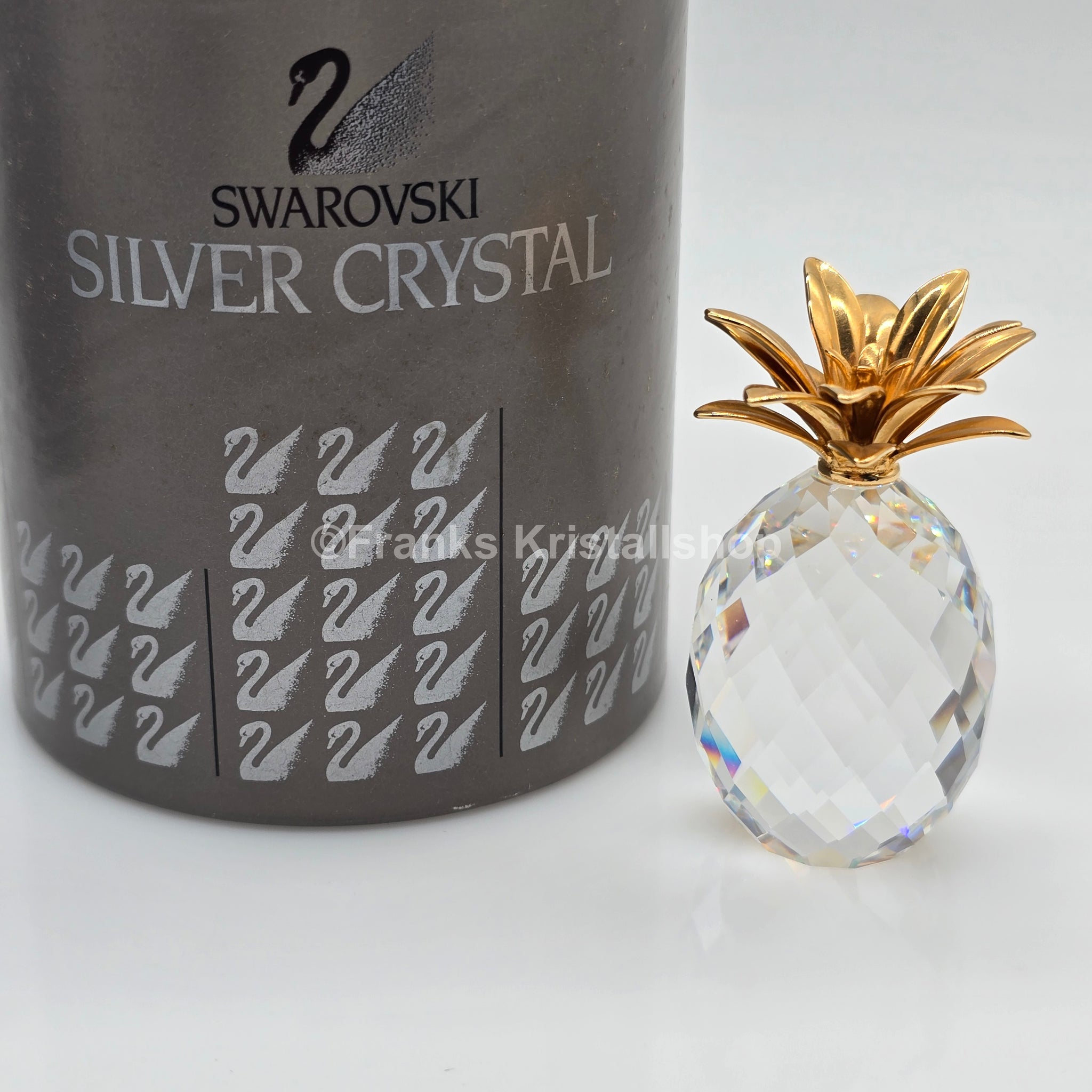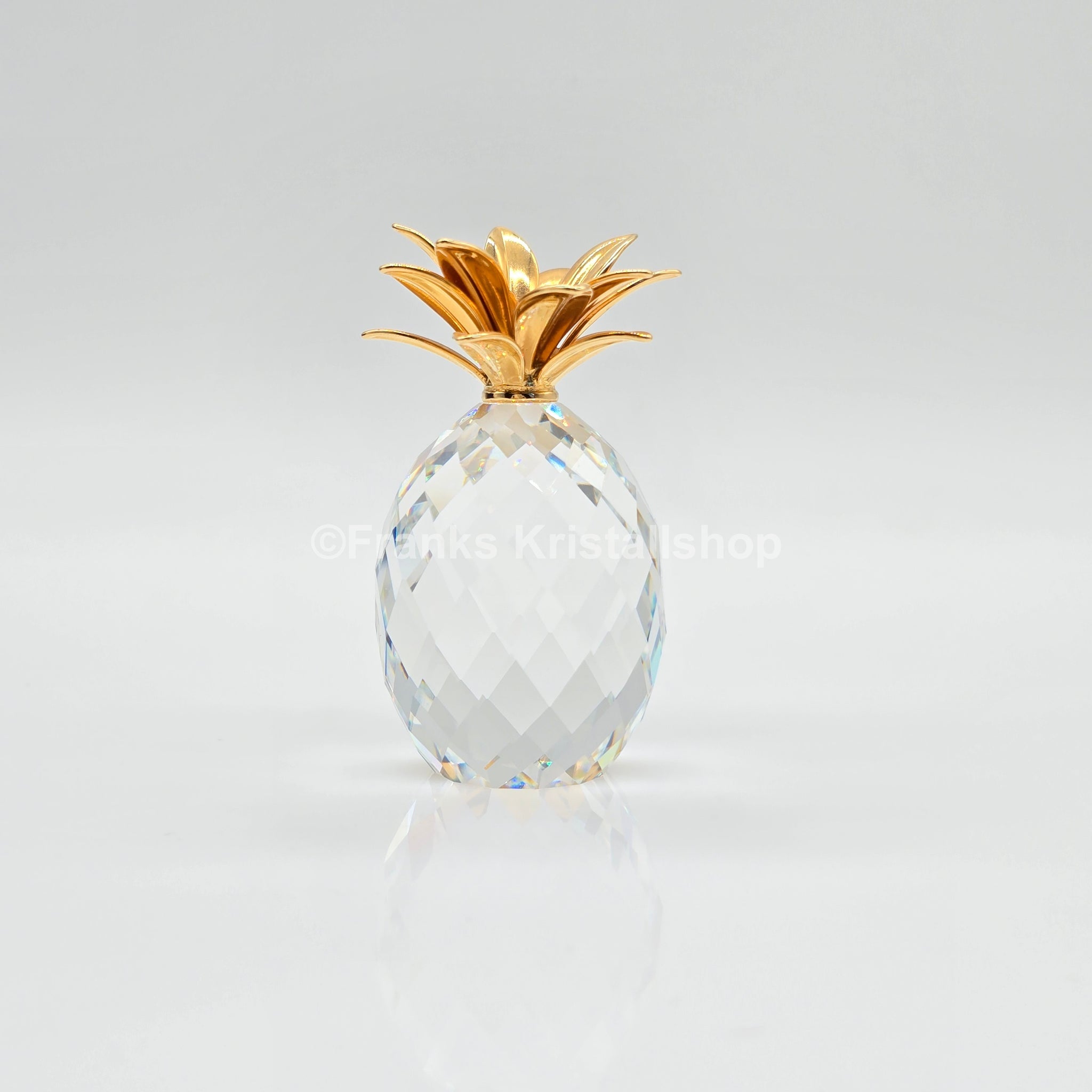 Die Ananas ist aus klarem Kristall mit zahlreichen Facetten gefertigt. Die Tropenfrucht hat vergoldete Blätter aus Metall und ist ca. 6.3 cm hoch.