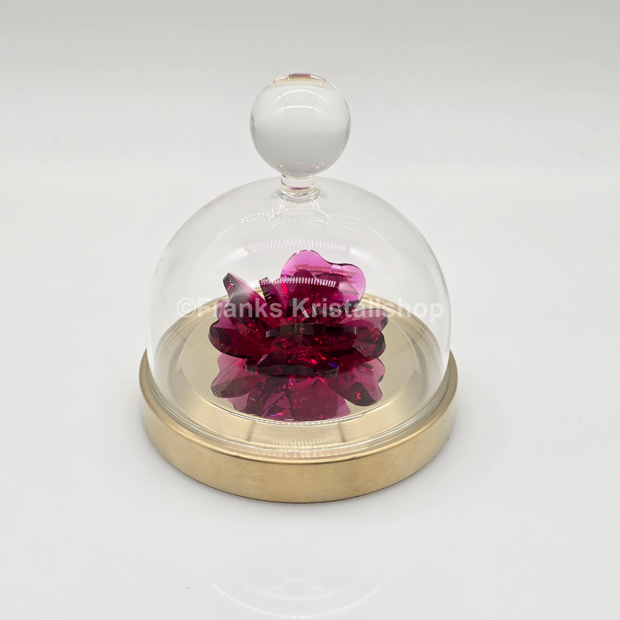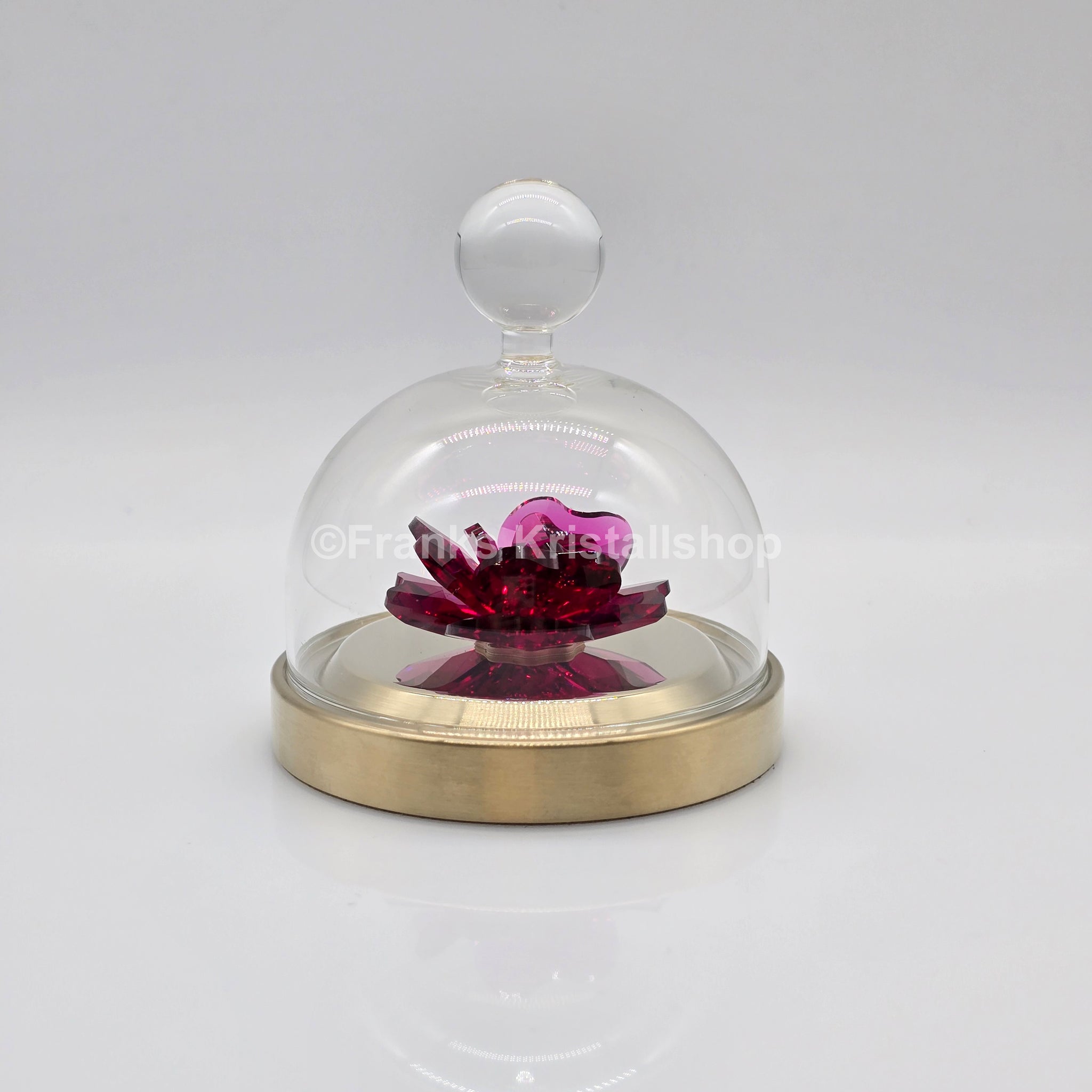 Diese Figur setzt eine rote Rose eindrucksvoll unter einer Glasglocke in Szene. Das Thema Blumen wird hier mit edlen Farben und feinen Details neu interpretiert. Die Rose selbst glänzt in leuchtendem Rot und funkelt mit einer Vielzahl an Facetten. Eingebettet in eine Glasglocke auf einem champagner-goldfarbenen Metallständer bringt dieses Design einen Hauch natürlicher Eleganz in jedes Zuhause.