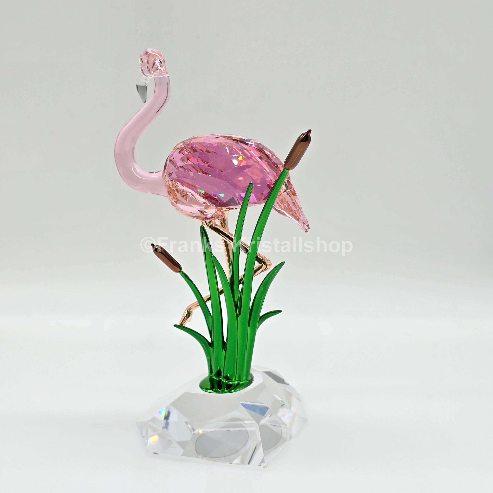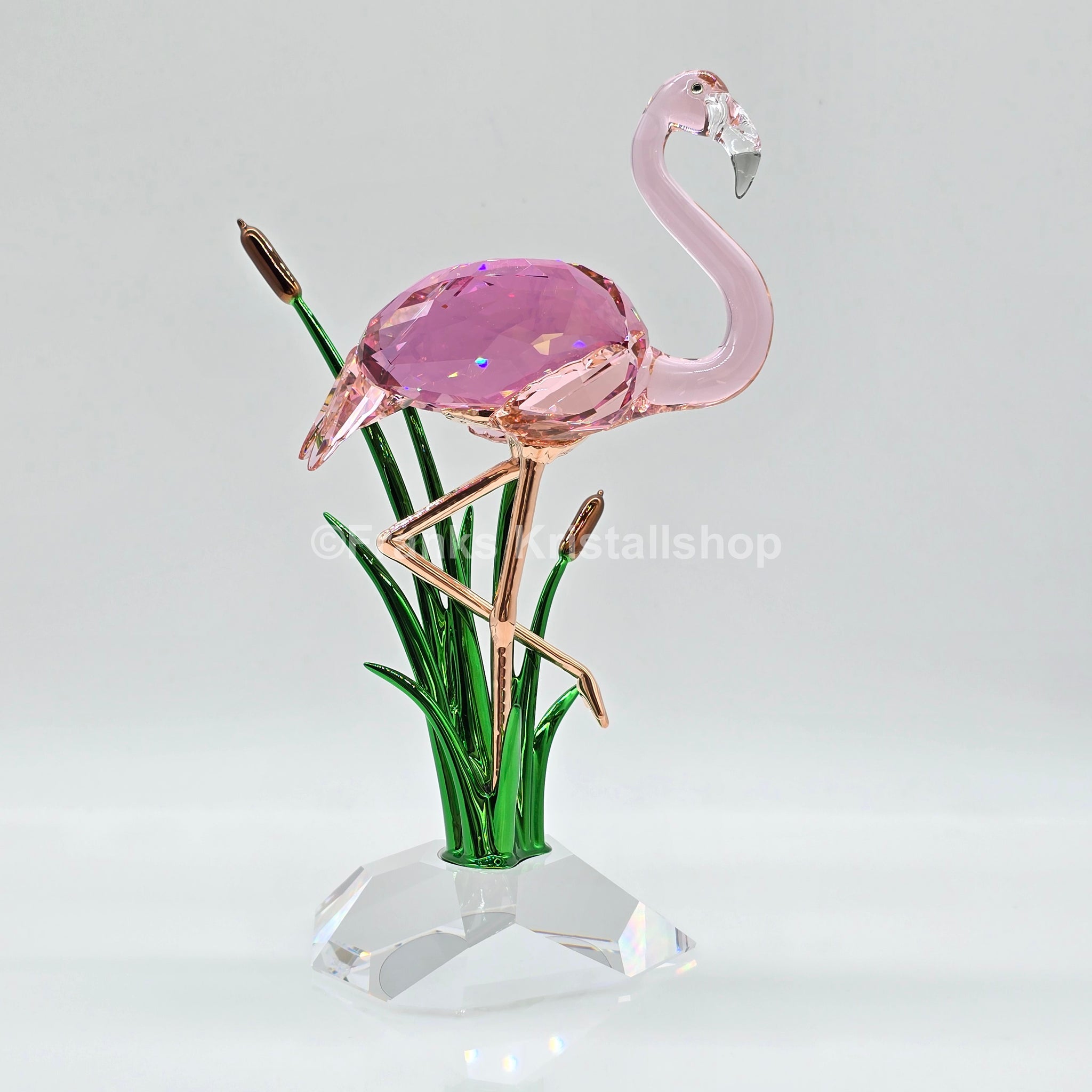 Diese eindrucksvolle Figur interpretiert die lebendige Eleganz des Flamingos auf moderne Weise. Zahlreiche geschliffene Facetten lassen das ikonische Pink intensiv strahlen. Filigrane Beine mit Roségold-Legierungsschicht und glänzend lackierte Blätter sowie Schilfrohre aus Metall vollenden die stilisierte Naturszene mit raffinierter Leuchtkraft.